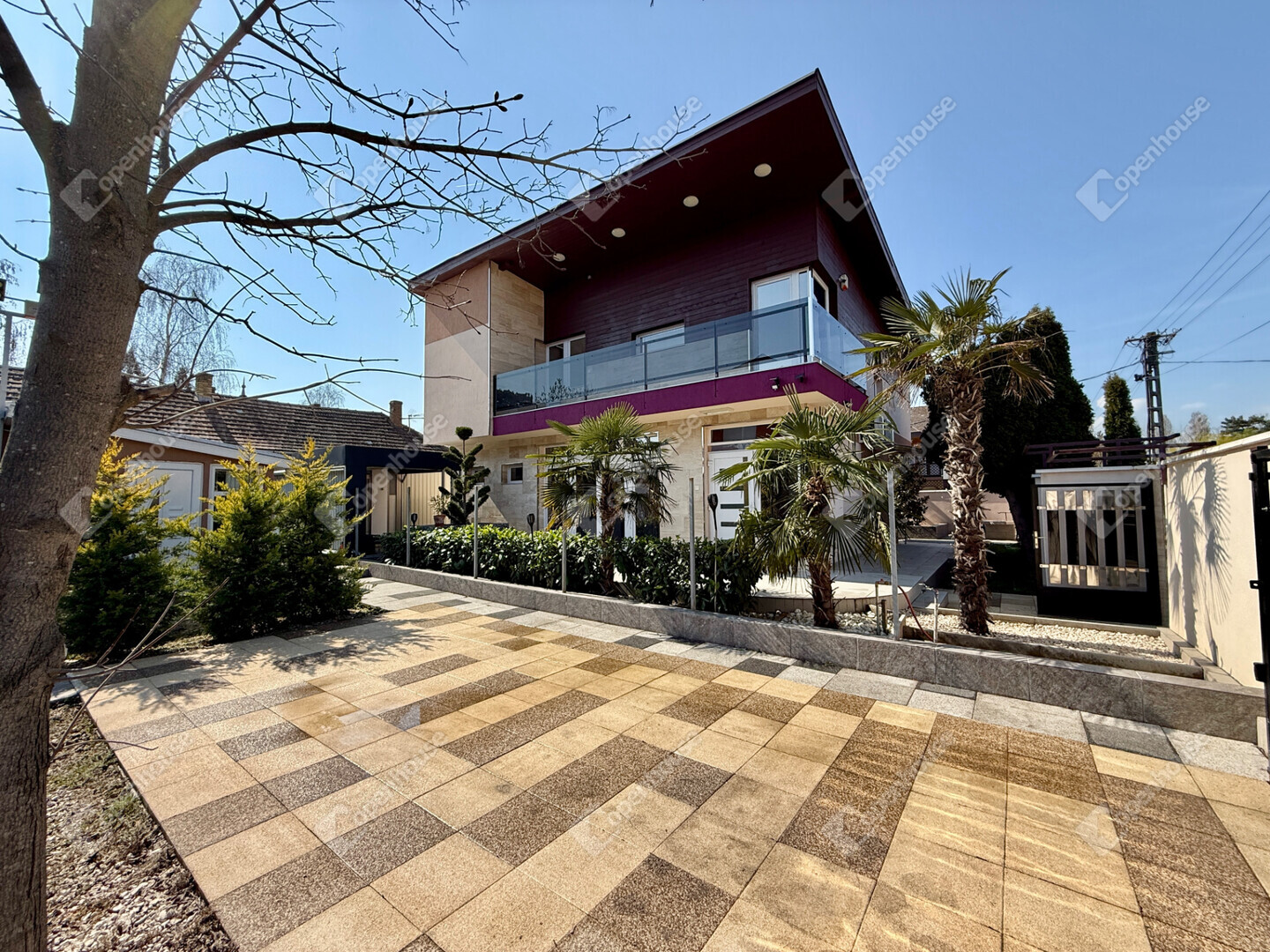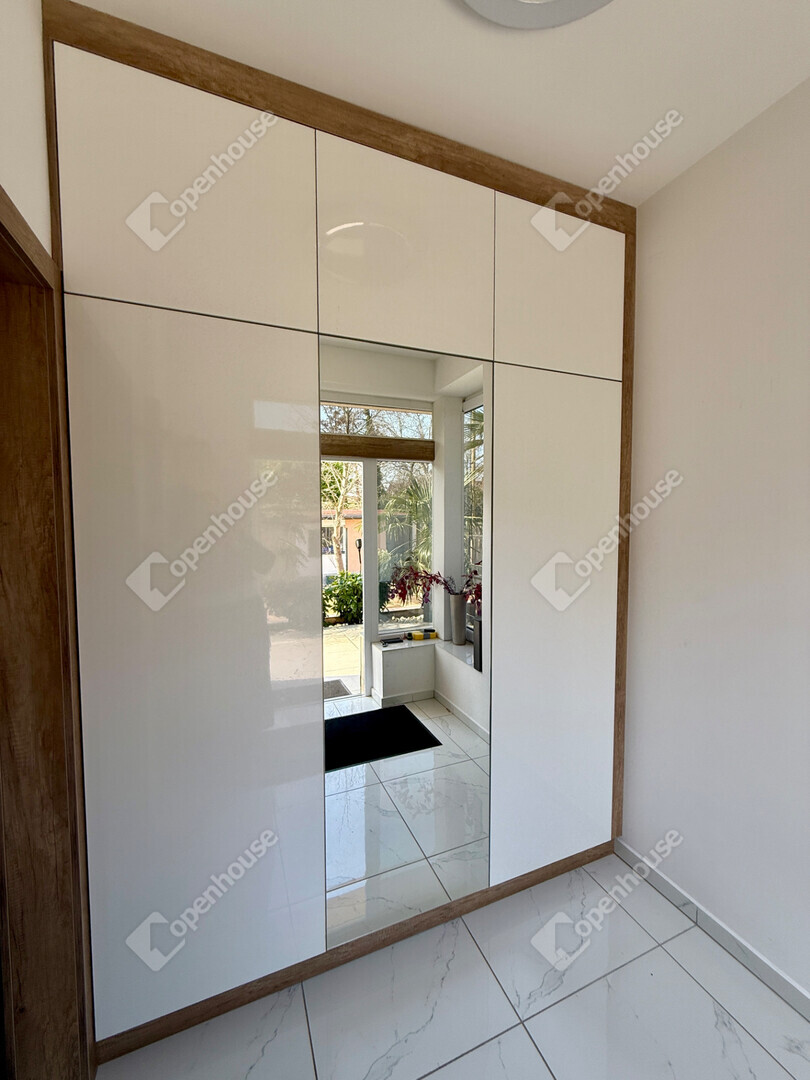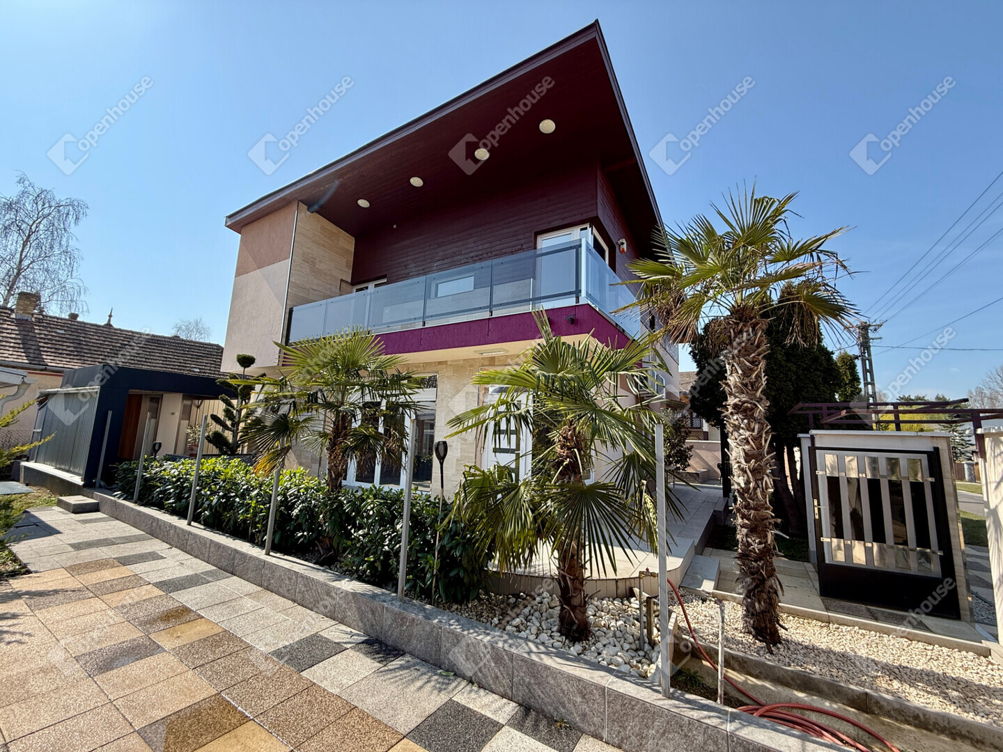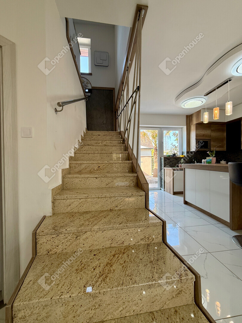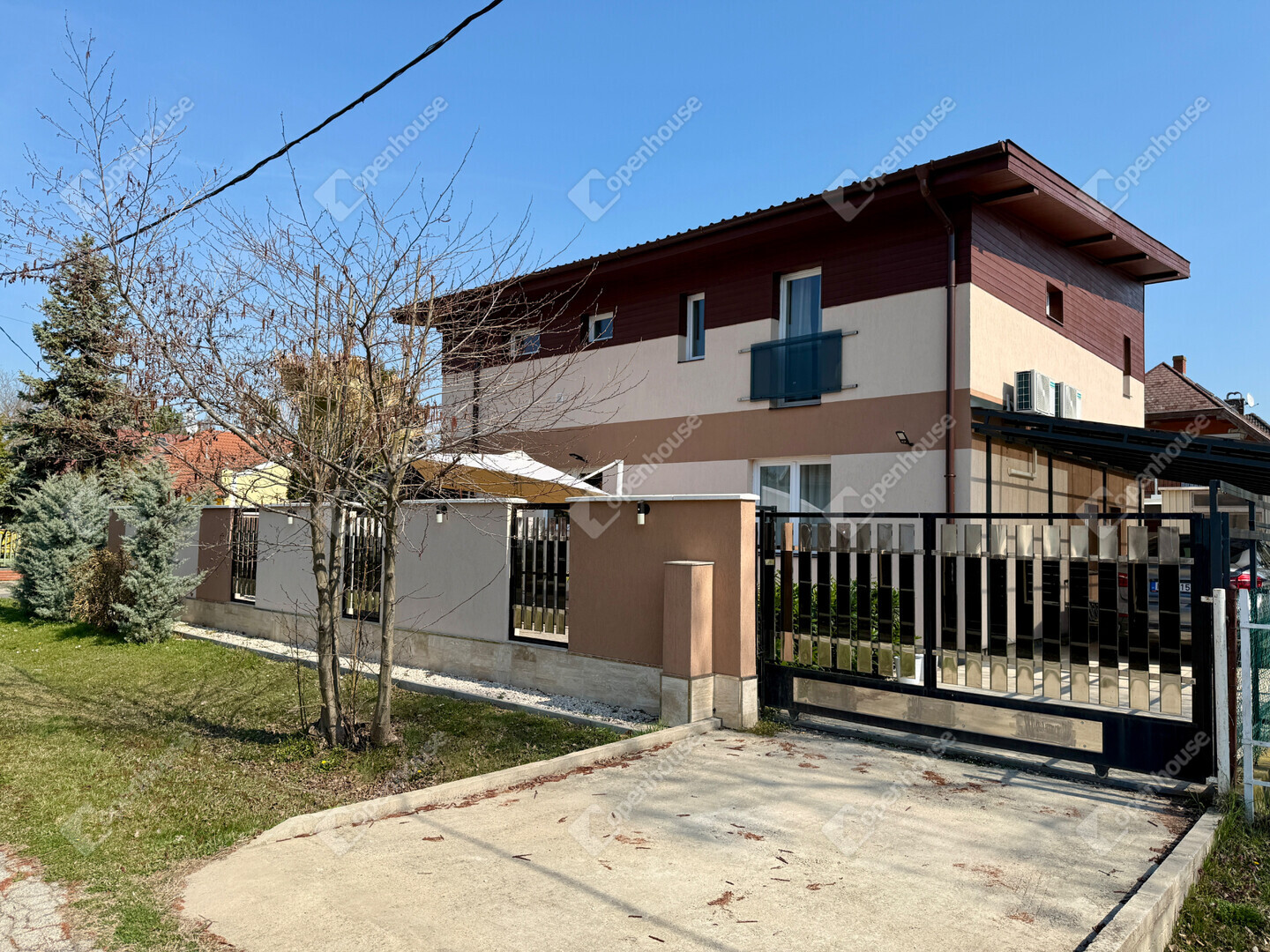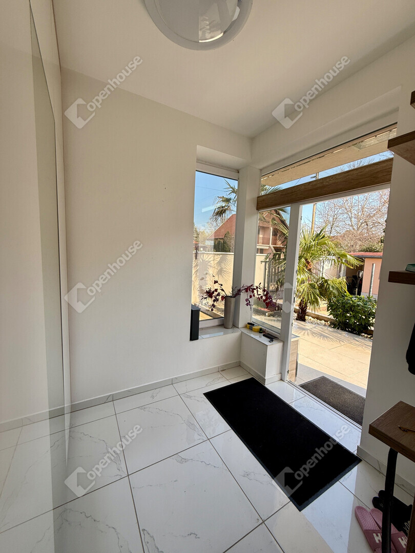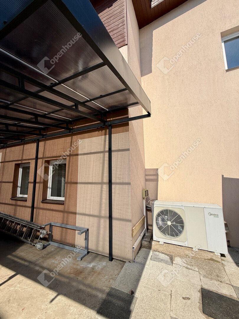 A mediterrán hangulatot árasztó ingatlan nemcsak esztétikájával, hanem praktikus kialakításával is kiemelkedik. A saroktelek adottságainak köszönhetően két irányból megközelíthető, így több autó számára is kényelmes parkolási lehetőséget biztosít – fedett és nyitott, zárt udvari beállókkal egyaránt.