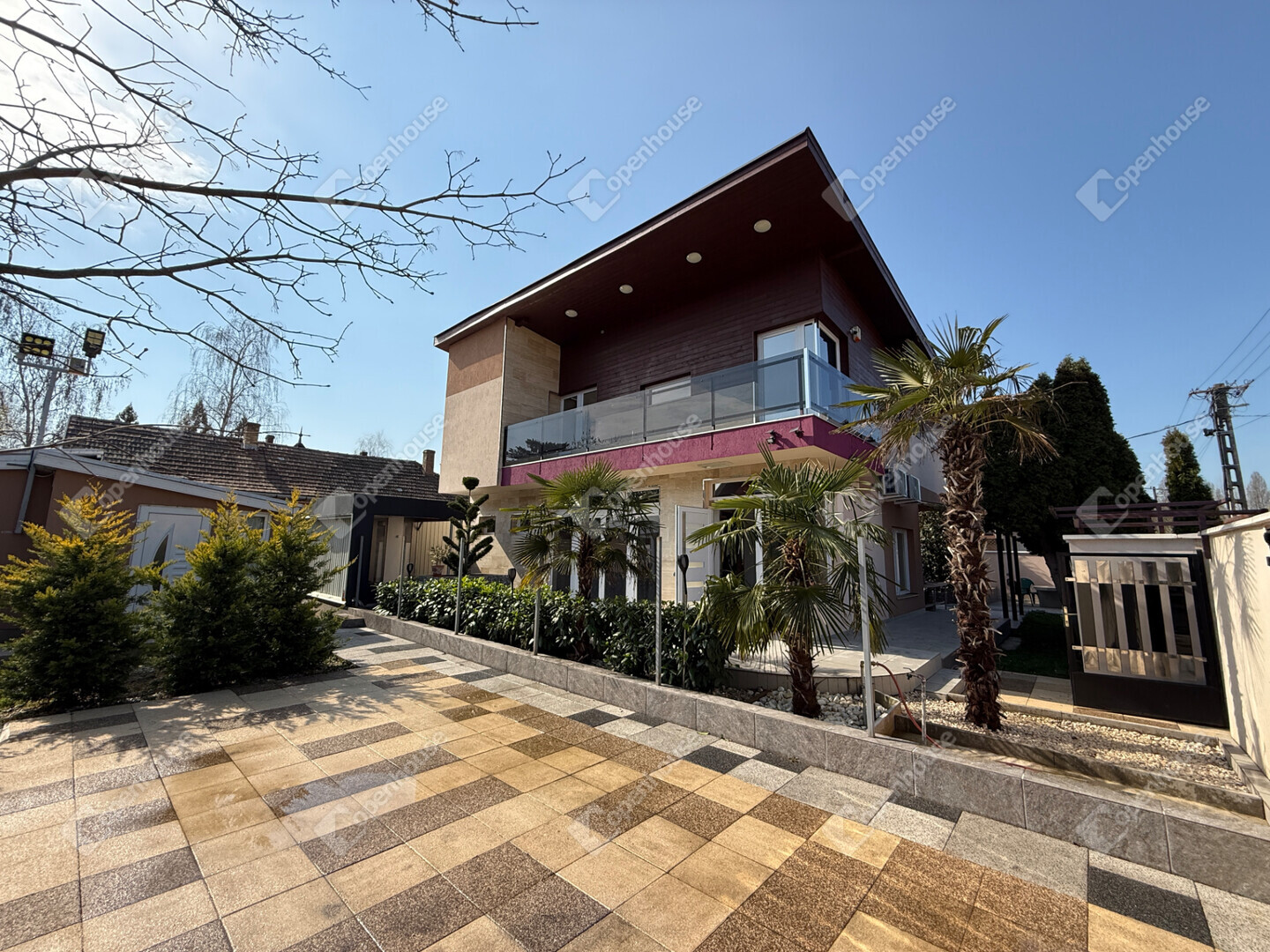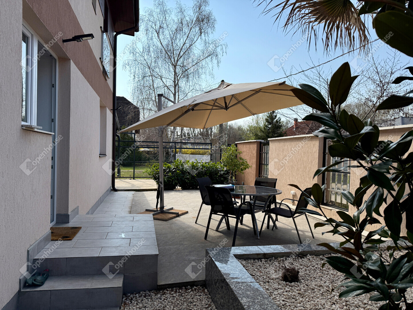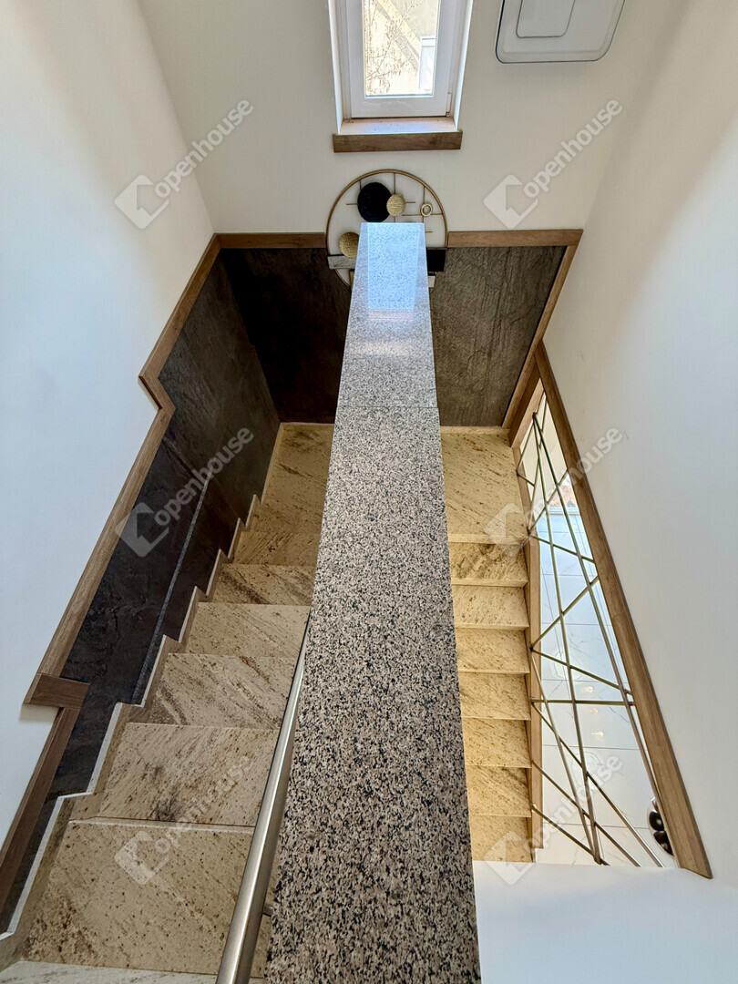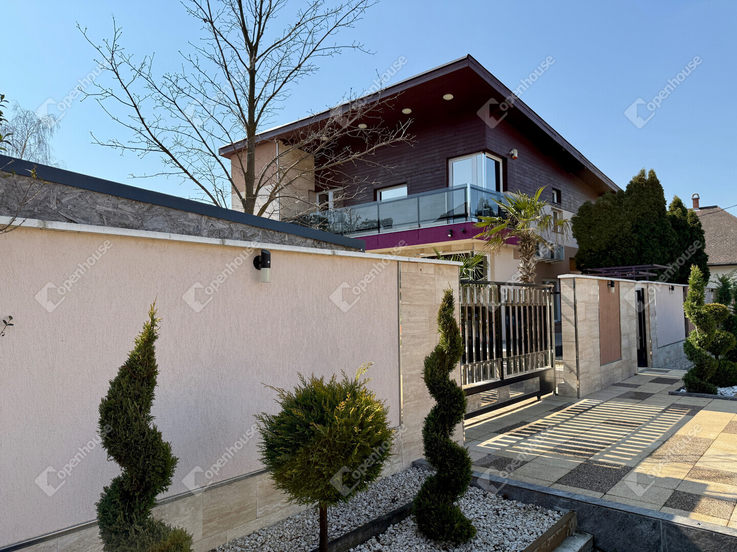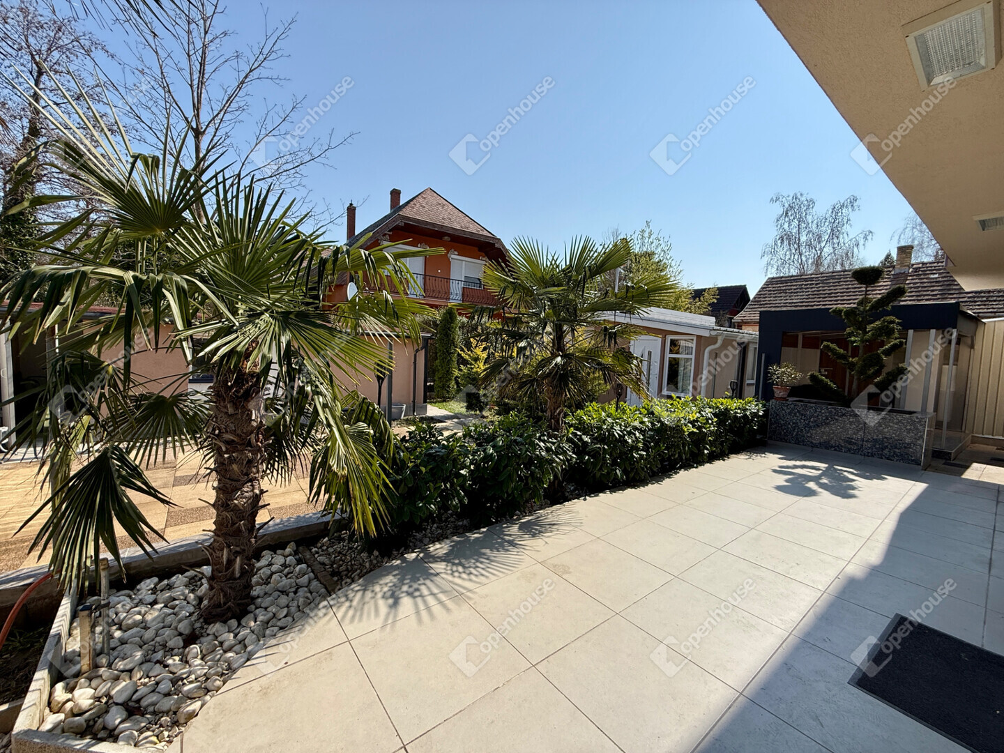 A mediterrán hangulatot árasztó ingatlan nemcsak esztétikájával, hanem praktikus kialakításával is kiemelkedik. A saroktelek adottságainak köszönhetően két irányból megközelíthető, így több autó számára is kényelmes parkolási lehetőséget biztosít – fedett és nyitott, zárt udvari beállókkal egyaránt.