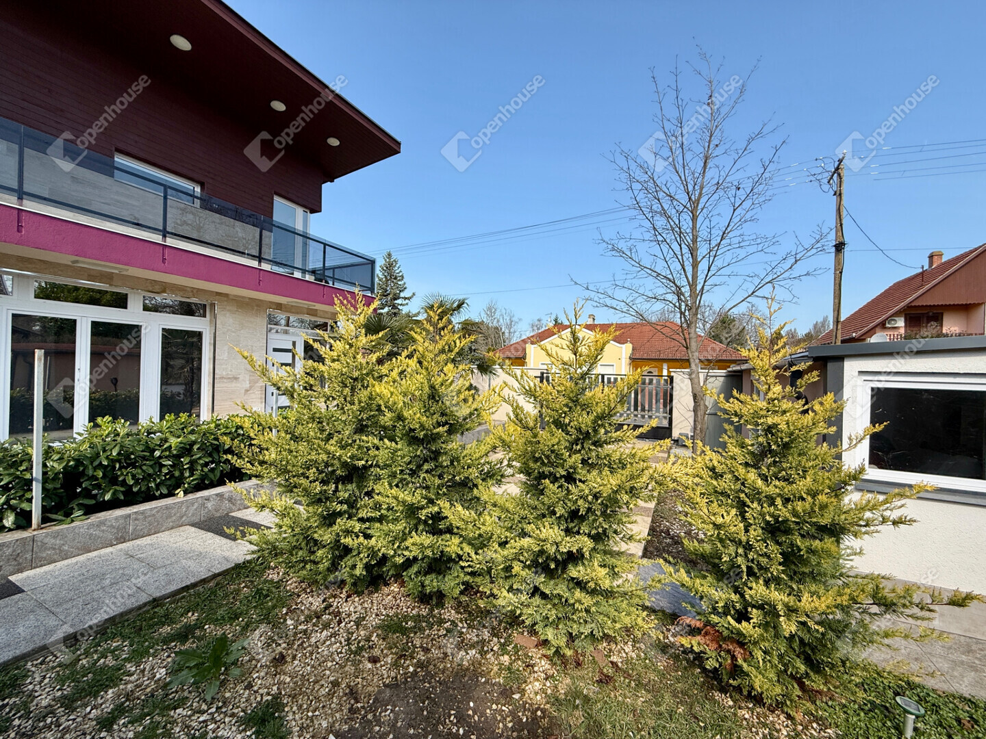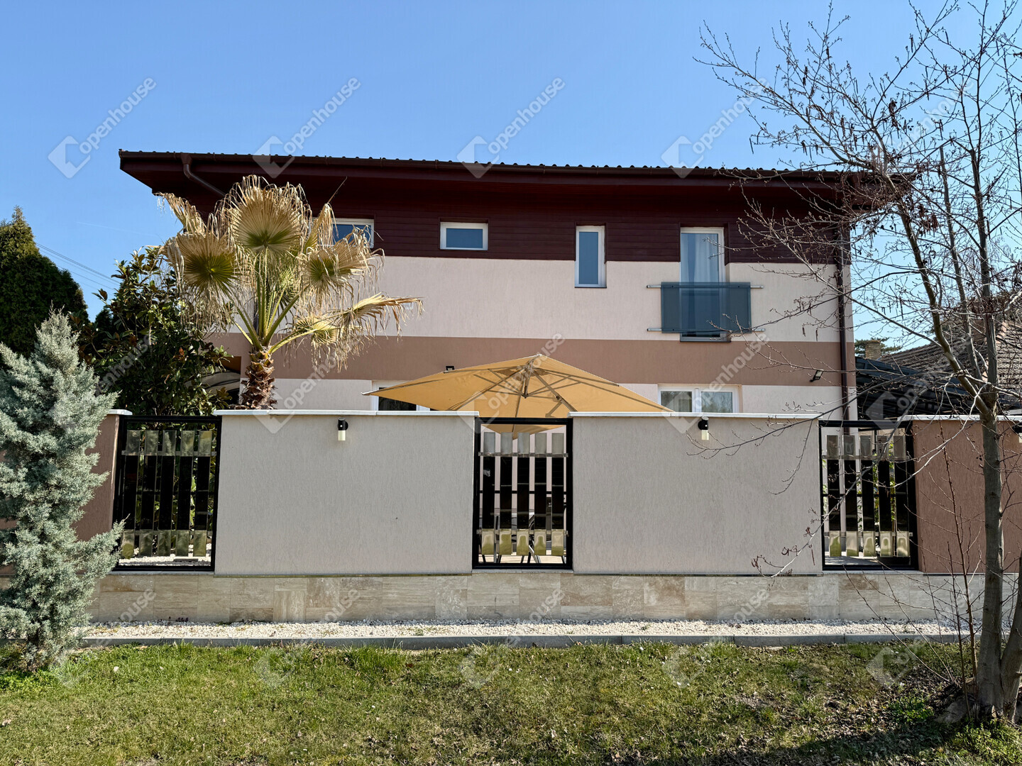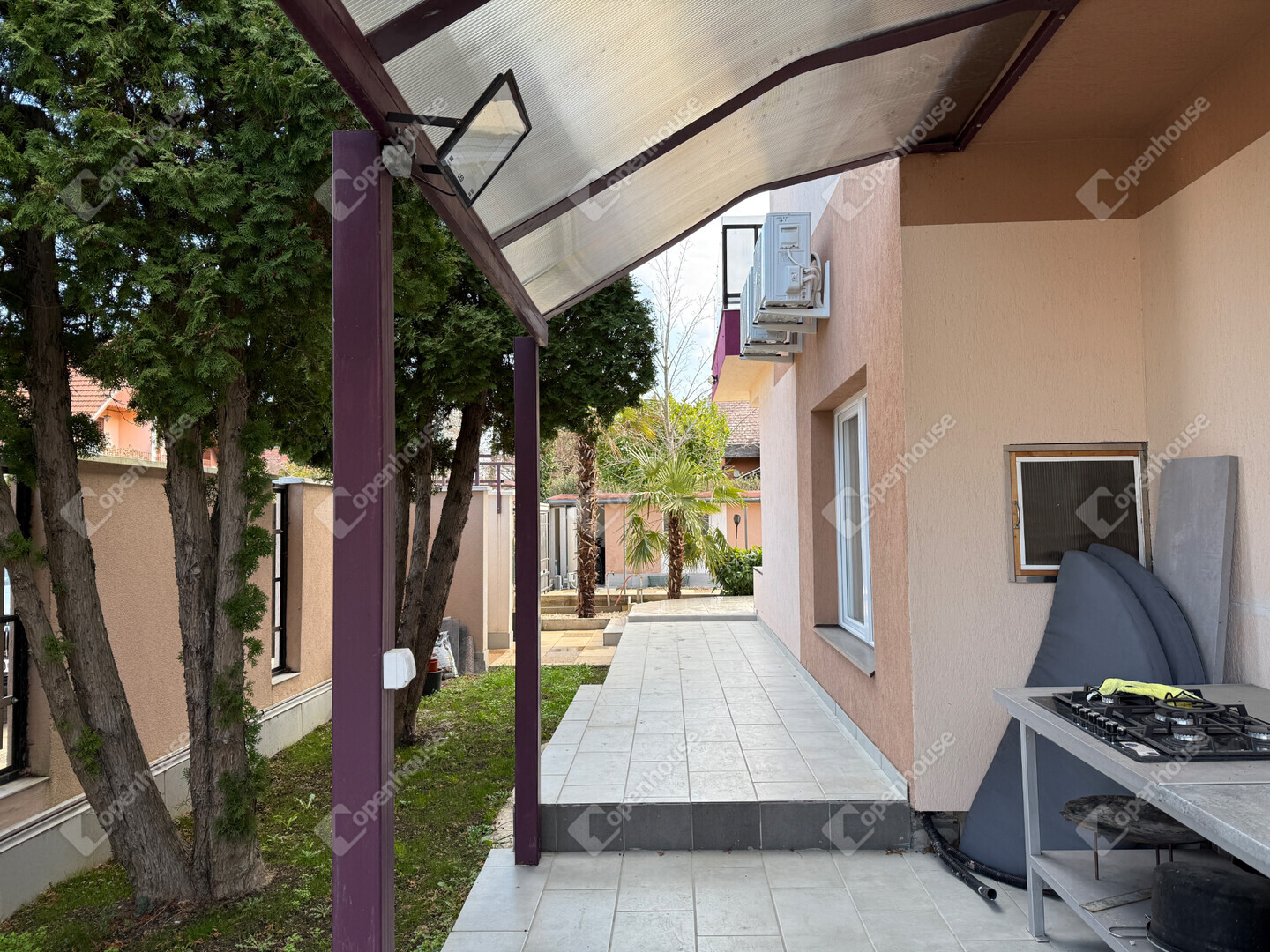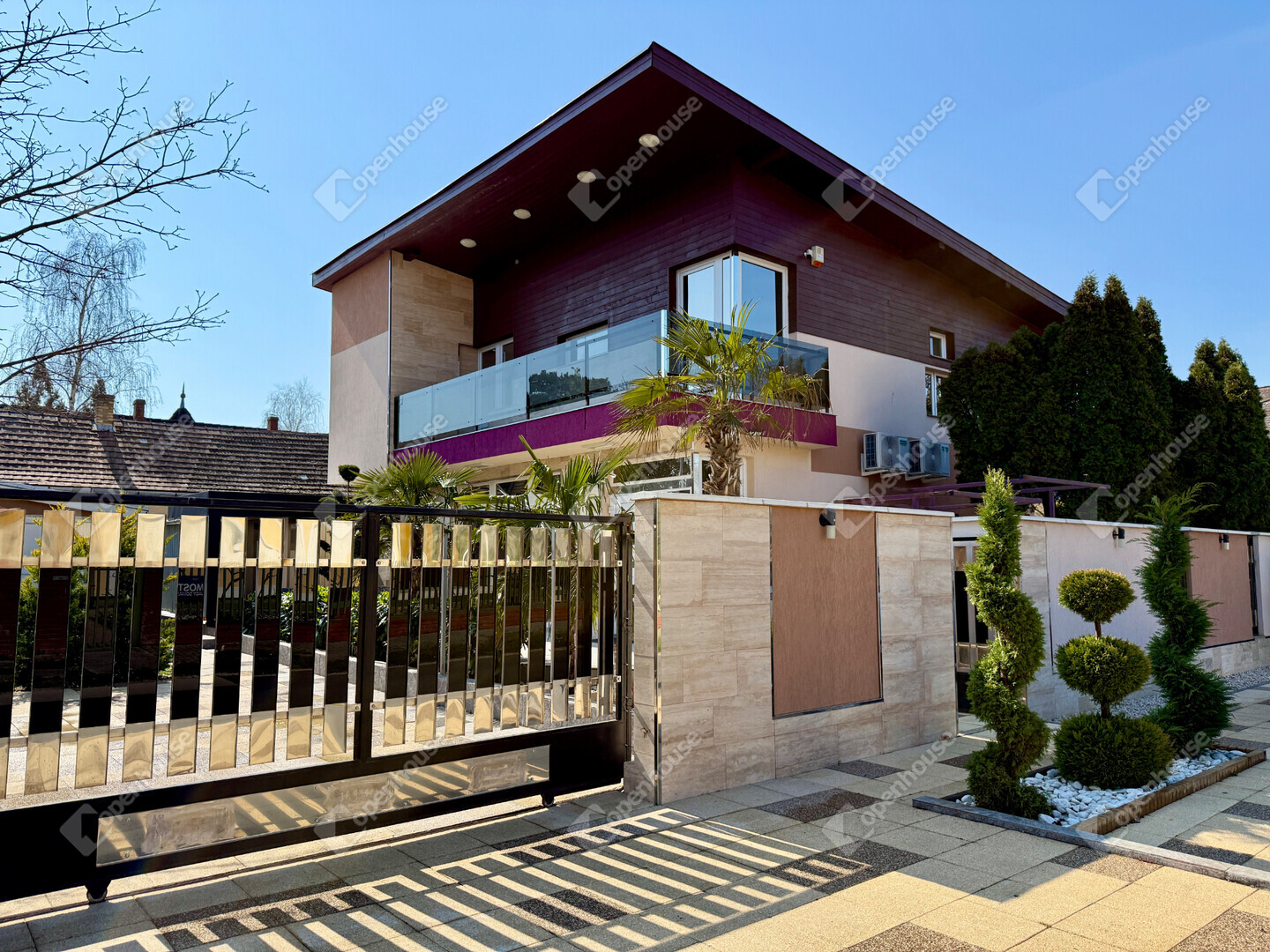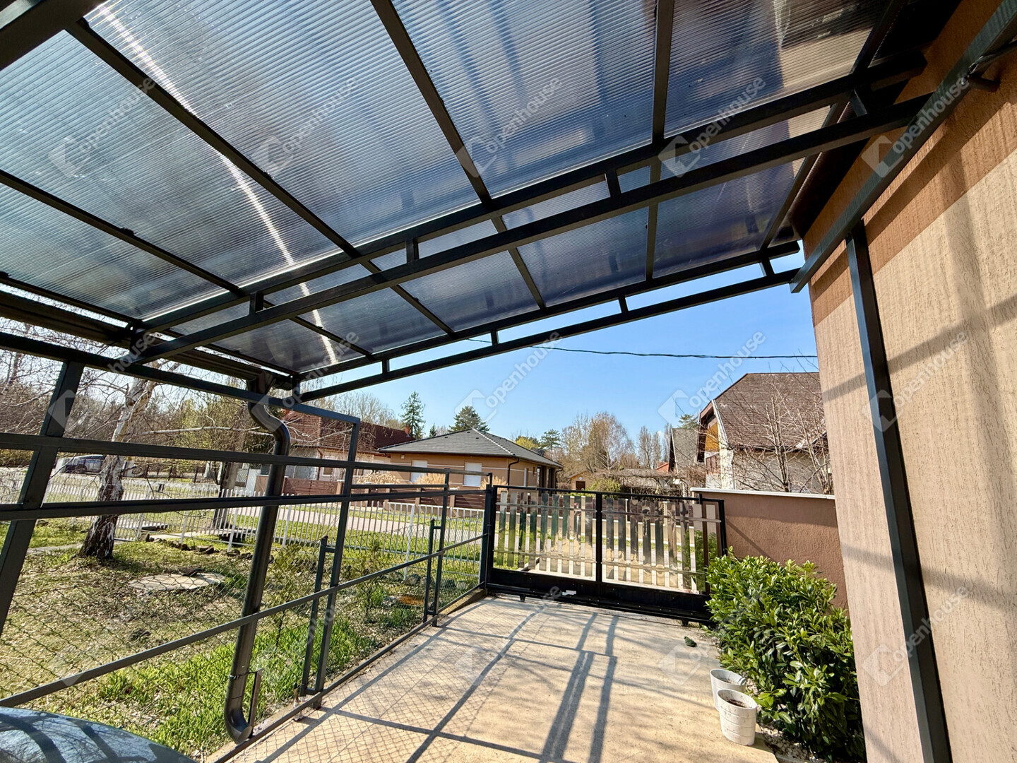 A mediterrán hangulatot árasztó ingatlan nemcsak esztétikájával, hanem praktikus kialakításával is kiemelkedik. A saroktelek adottságainak köszönhetően két irányból megközelíthető, így több autó számára is kényelmes parkolási lehetőséget biztosít – fedett és nyitott, zárt udvari beállókkal egyaránt.