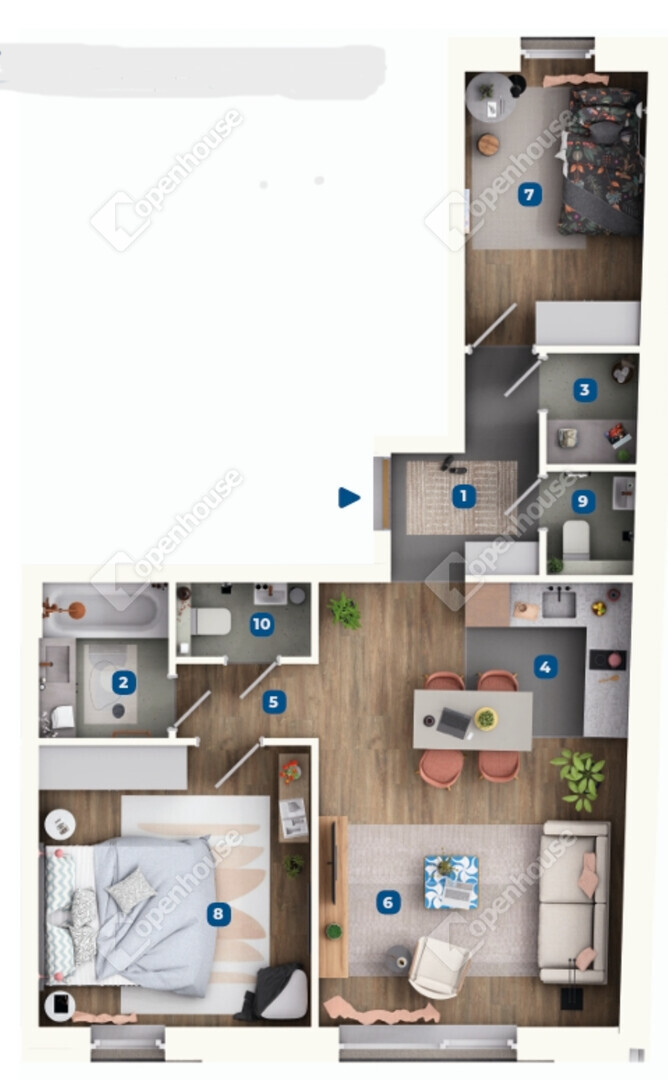 Amerikai konyhás nappali, 2 hálószoba, előszoba, közlekedő, fürdő, 2 külön WC és háztartási helyiség került kialakításra a lakásban.