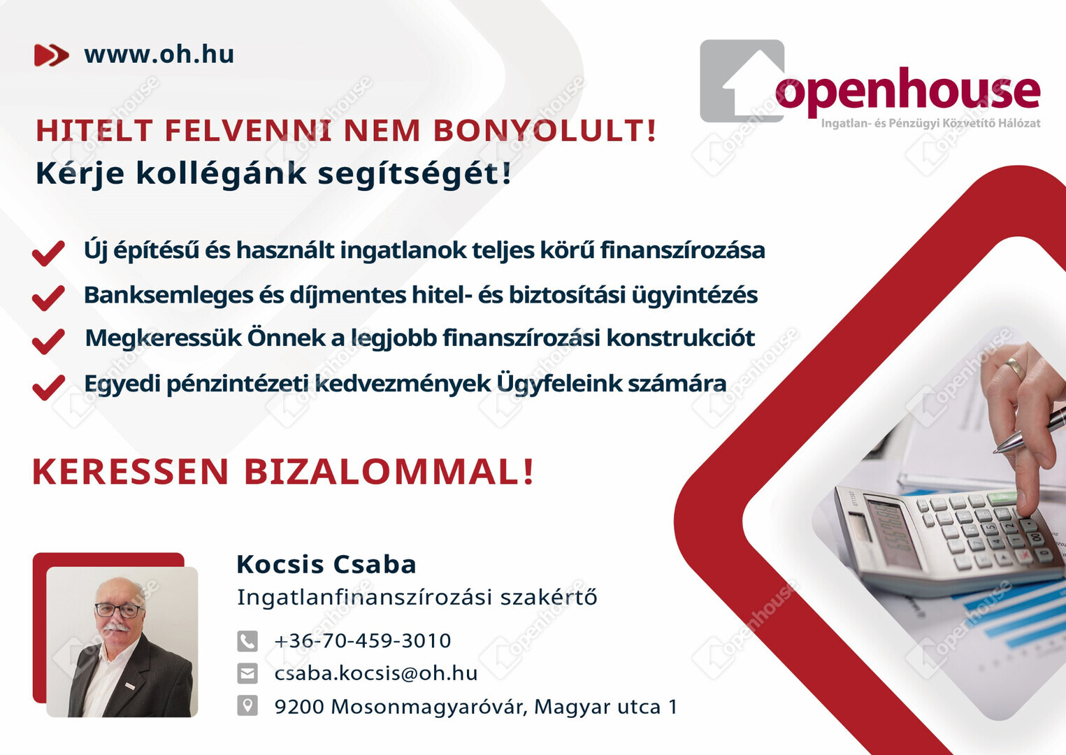 Az Openhouse Mosonmagyaróvár Ingatlaniroda tagjaként várom Önt az országos hálózatunk teljes kínálatával.