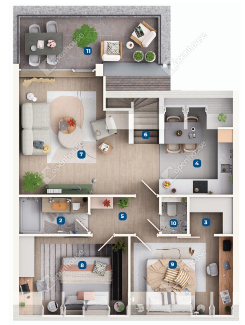 Amerikai konyhás nappali, 2 hálószoba, előszoba, közlekedő, fürdő, külön WC, gardrób, lépcső és 10,18 m² terasz került kialakításra a lakásban.