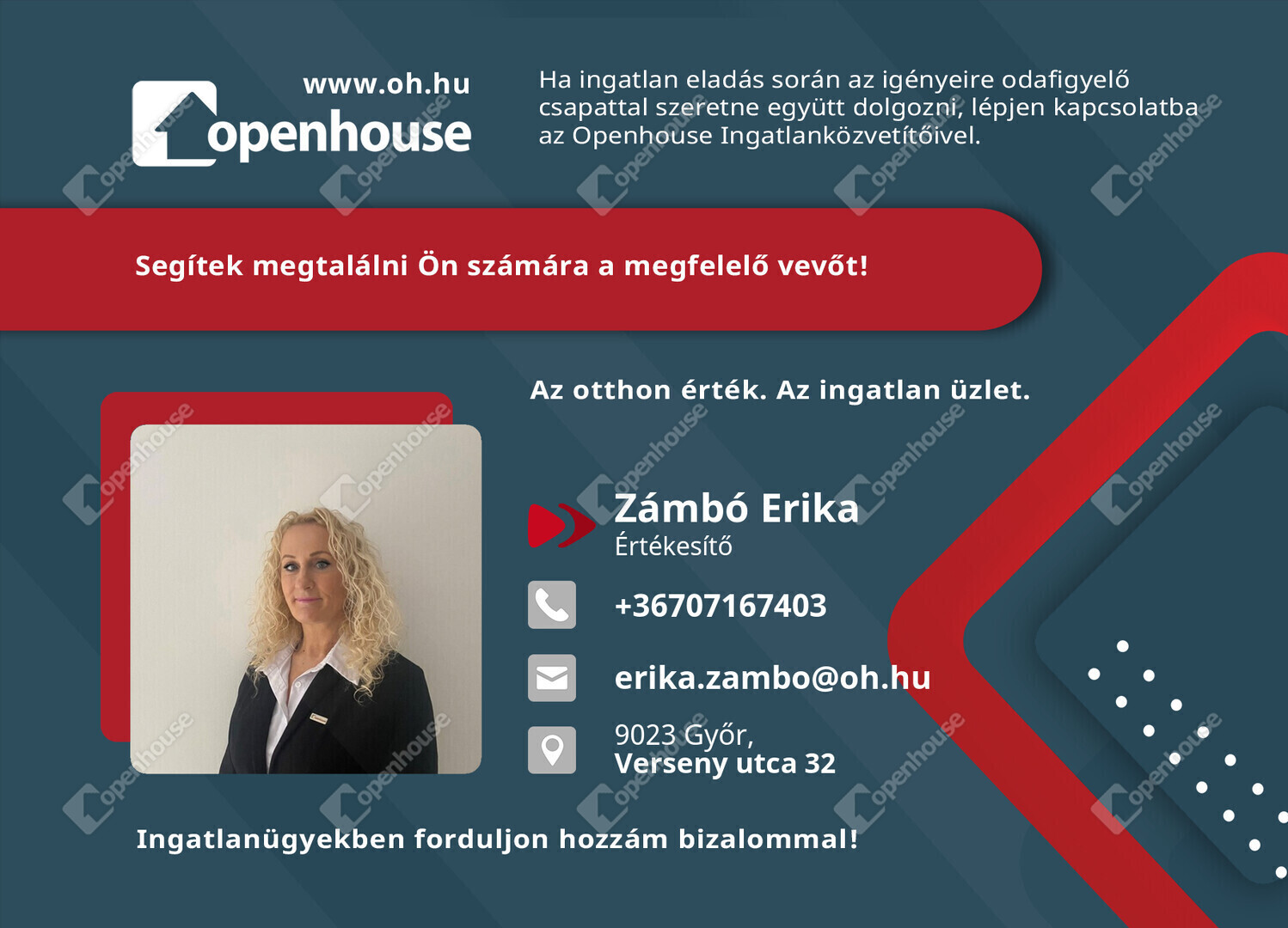 Az Openhouse Center - Győr Ingatlaniroda tagjaként várom Önt az országos hálózatunk teljes kínálatával.