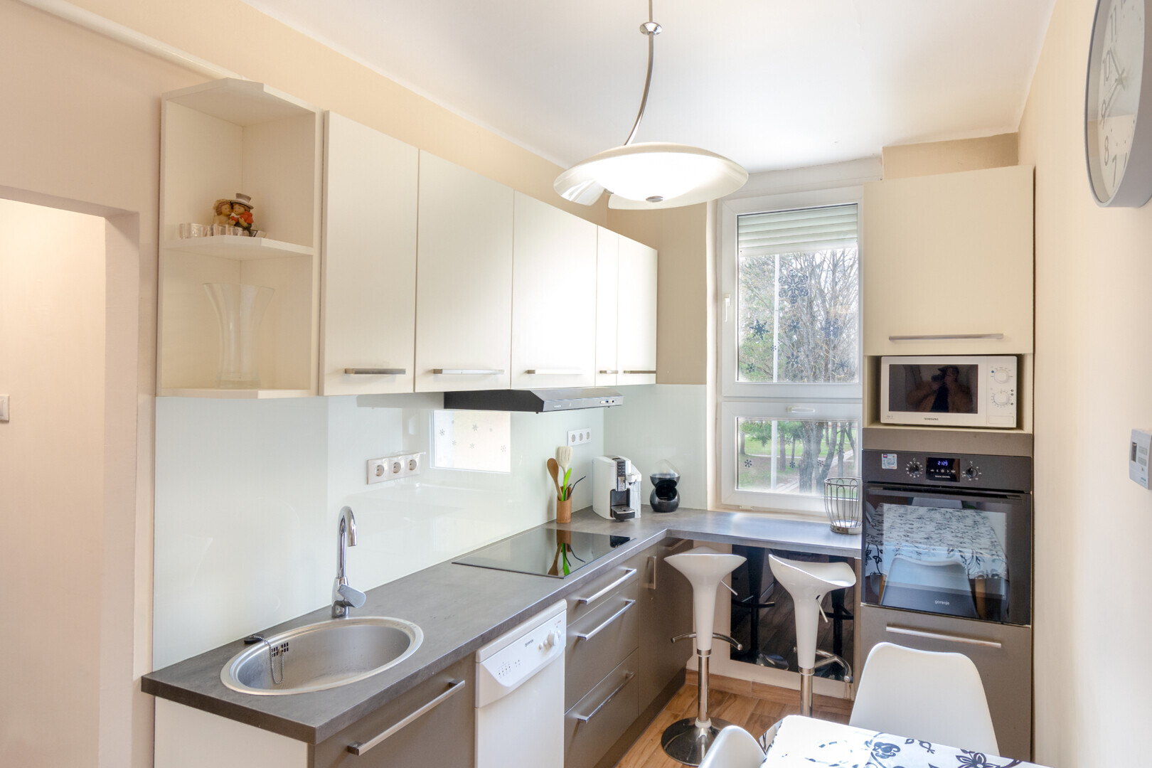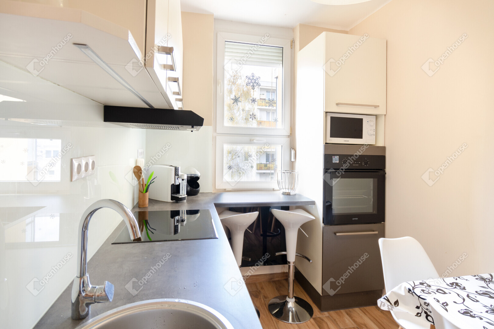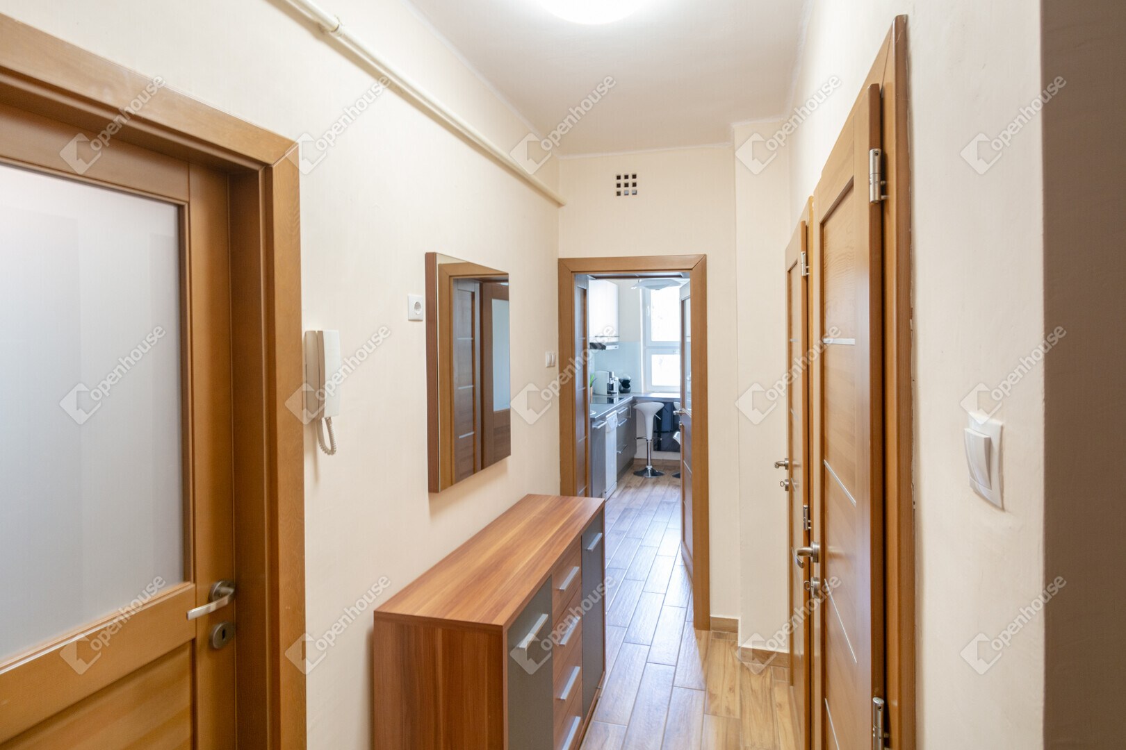 modern burkolatok, korszerű beltéri ajtók, valamint egy 5–7 éves, modern konyhabútor, amelyhez szinte új állapotú gépek tartoznak.