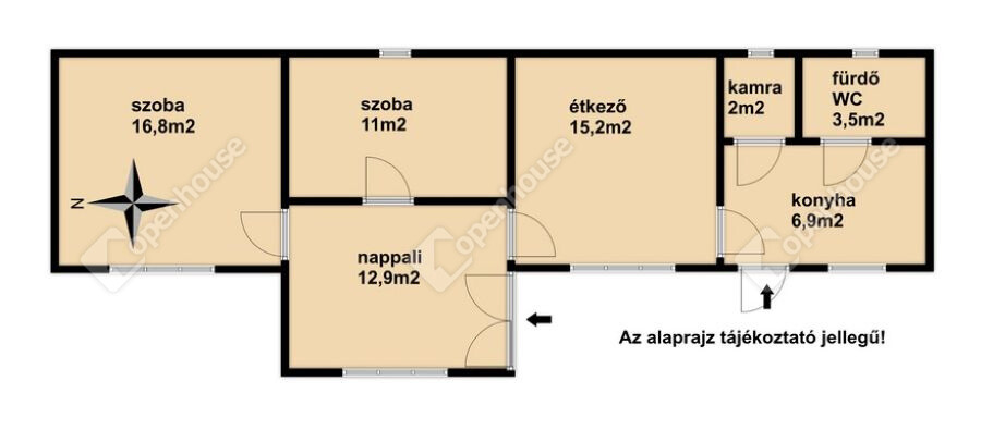 - 2 hálószoba, nappali, étkező, konyha, fürdőszoba-wc-vel, kamra helyiségekből áll a lakótér.