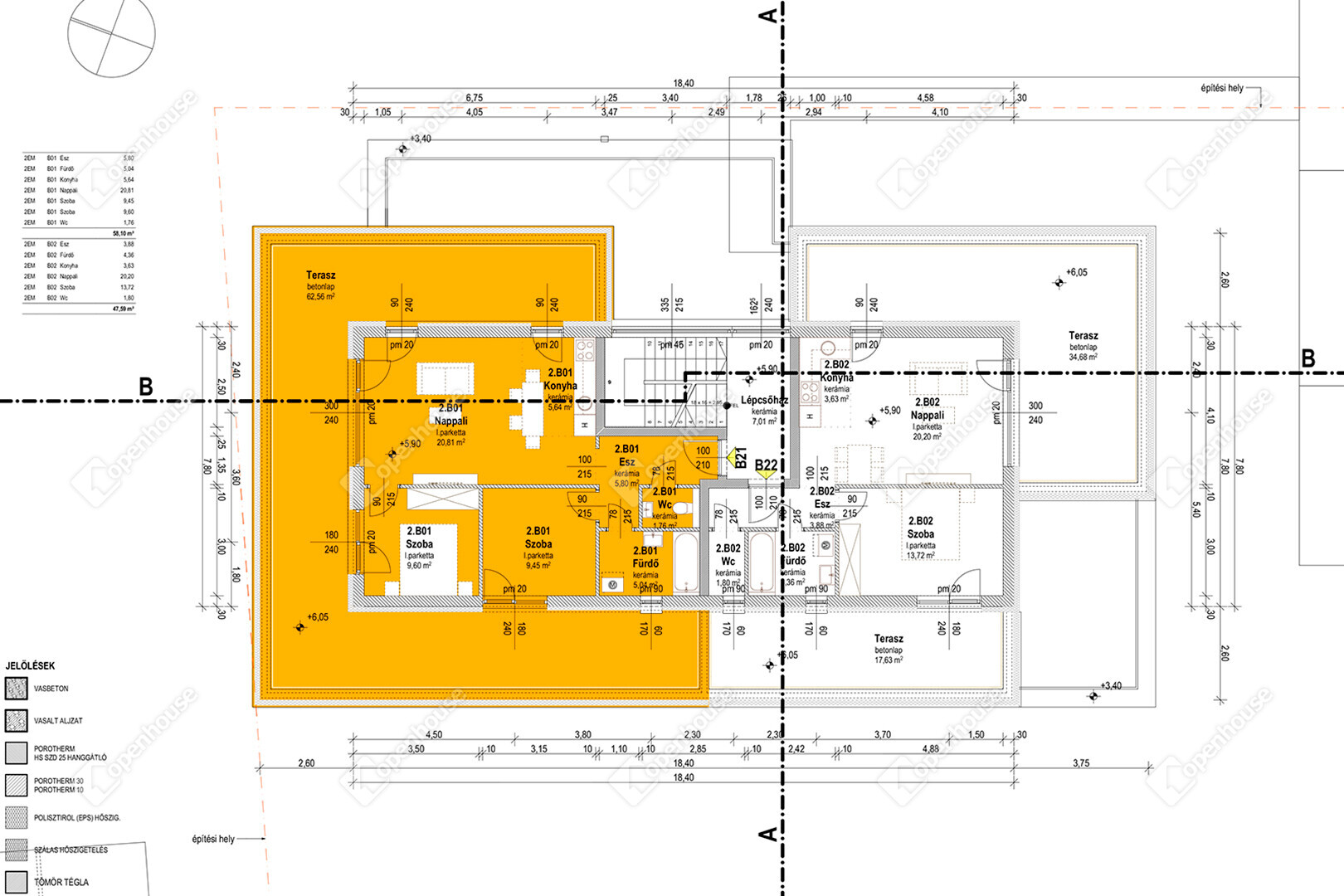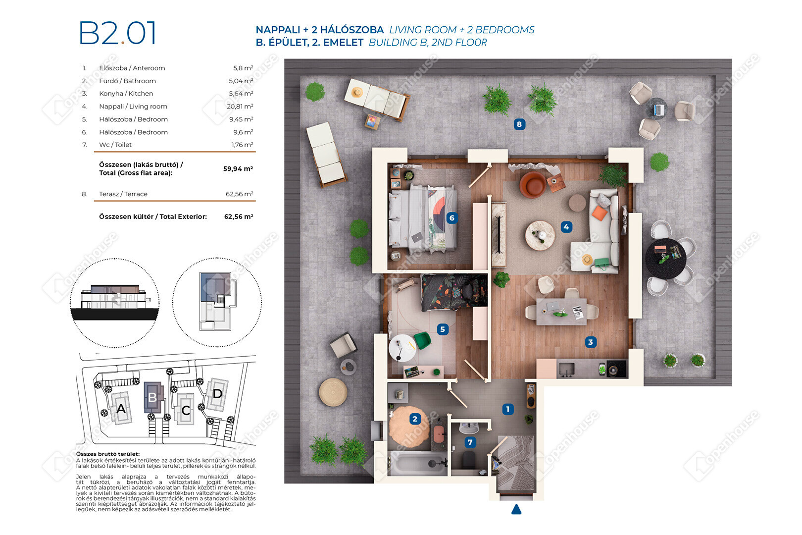 - Elhelyezkedés: a „B” épület legfelső. 2. emeletén található, kívül végig terasszal övezett kialakításban, ÉNY tájolással