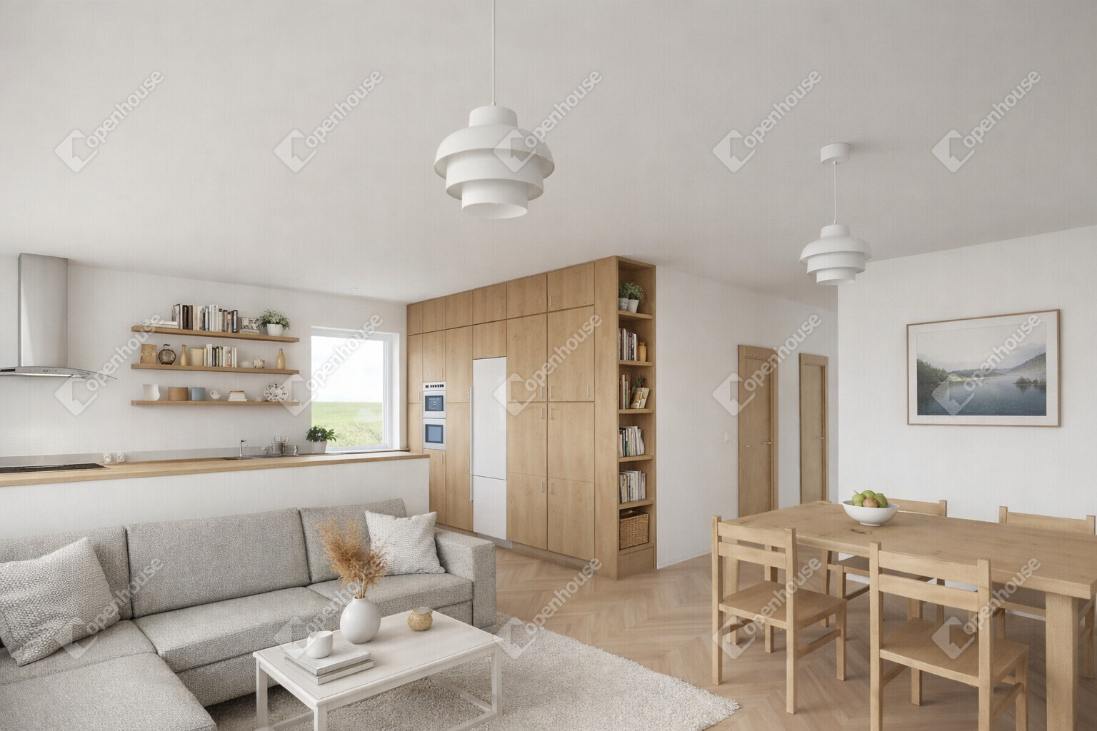 A központi térben egy világos, amerikai konyhás nappali kap helyet, amely a családi élet központja lehet.