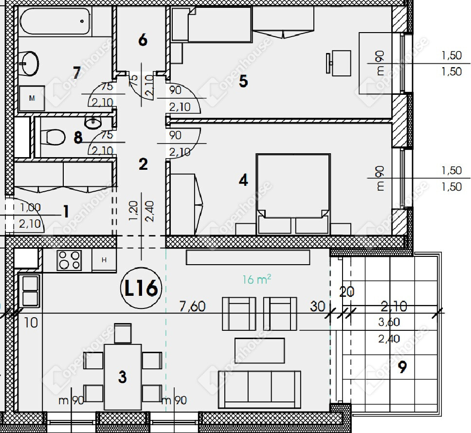 | Amerikai konyha | 30.04 m2 | Járólap |