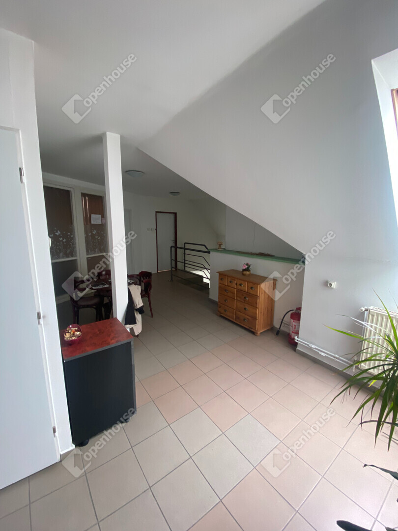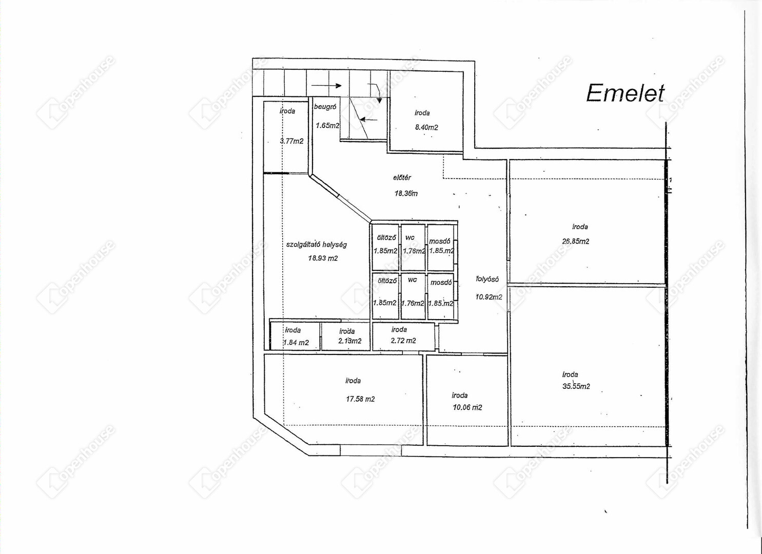 Az emeleten -melynek mérete 177 m² különböző méretű irodák mellett szolgáltató helység, mosdók, WC-k helyezkednek el, van amelyik bérlővel együtt, van amelyik bérlőre várva eladó!