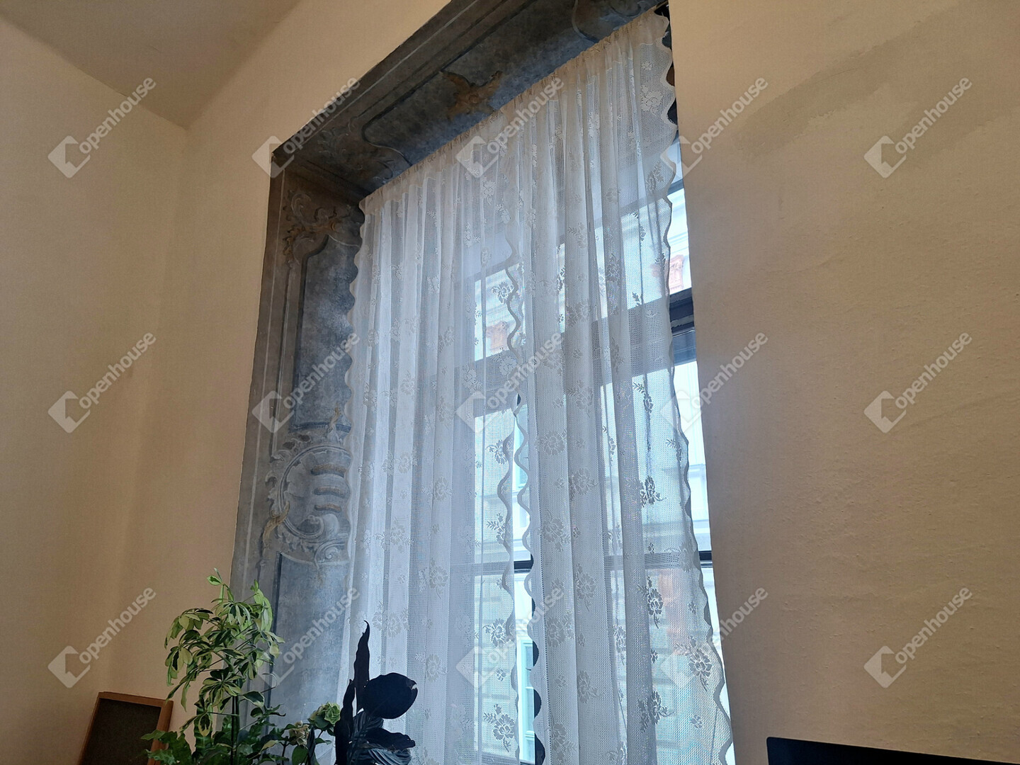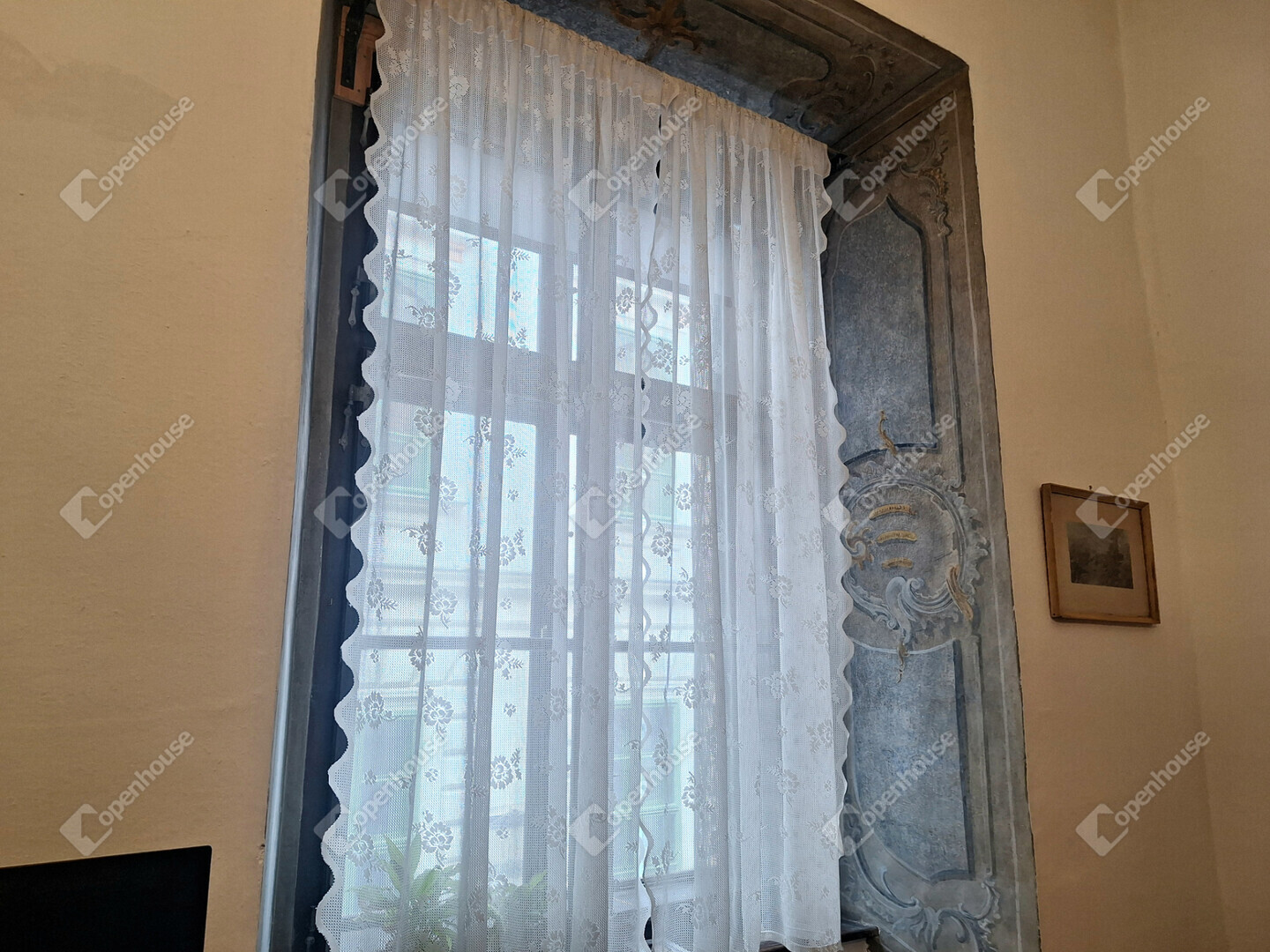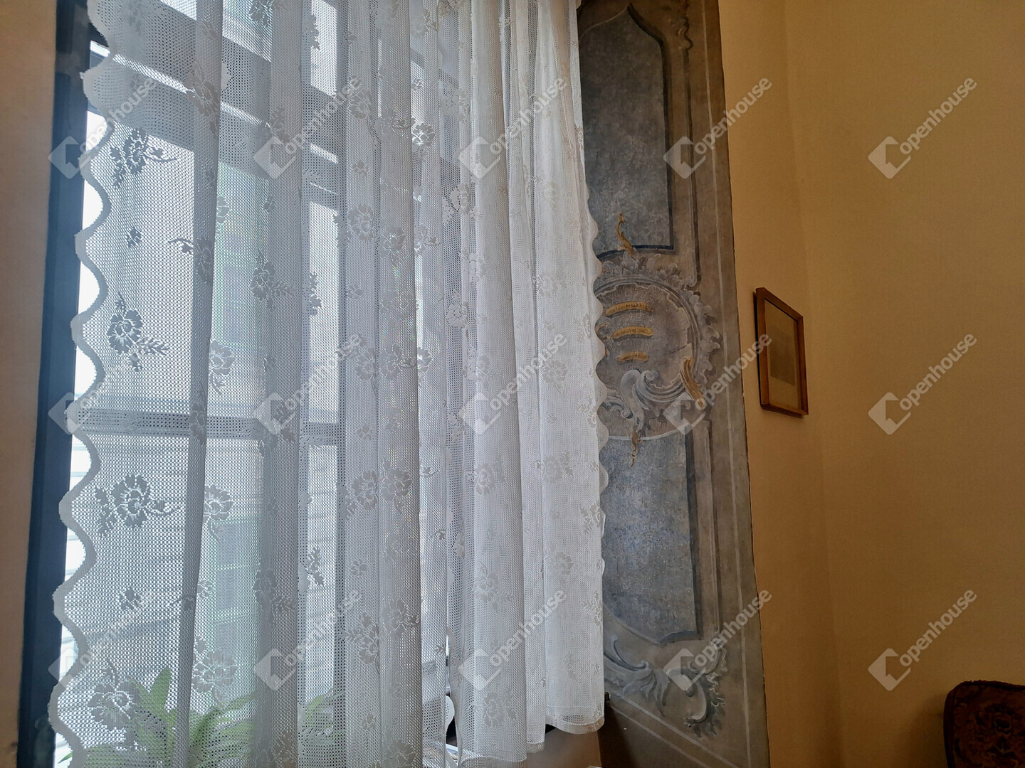 Külön figyelmet érdemel, hogy az ablakok belső részén, az úgynevezett ablakkávában (az ablak körüli belső falszakaszon) eredeti freskófestés maradt fenn, ami rendkívül ritka és exkluzív részlet. Ez a díszítés nemcsak esztétikai élményt nyújt, hanem tovább erősíti az ingatlan történelmi atmoszféráját és egyediségét.
