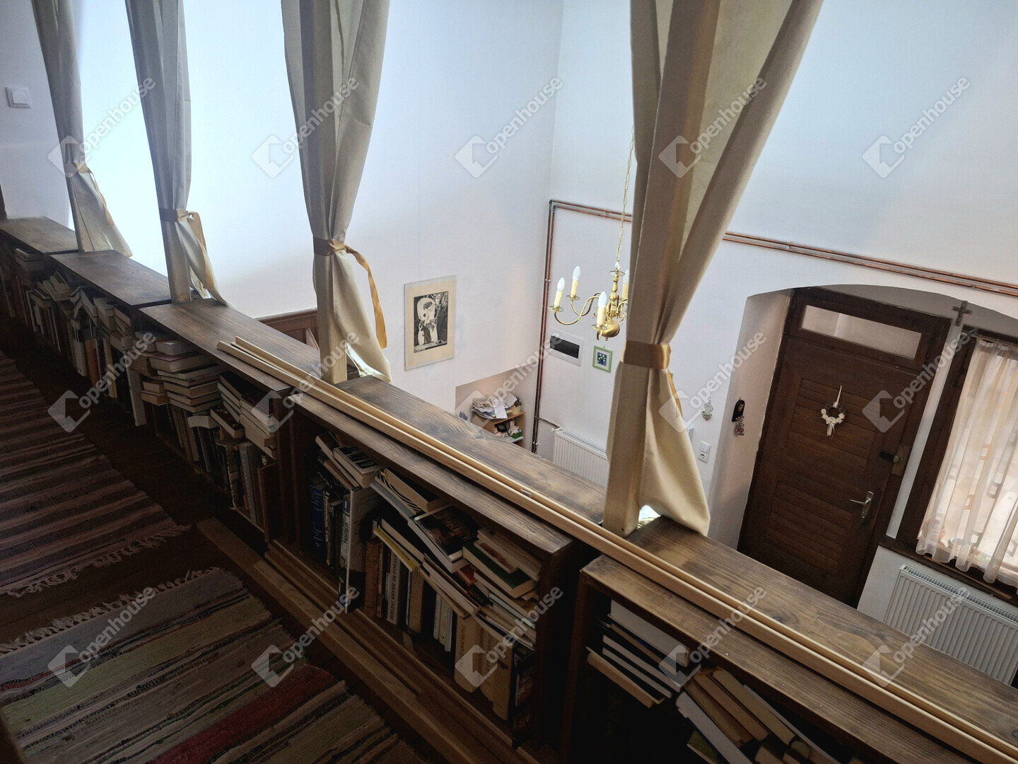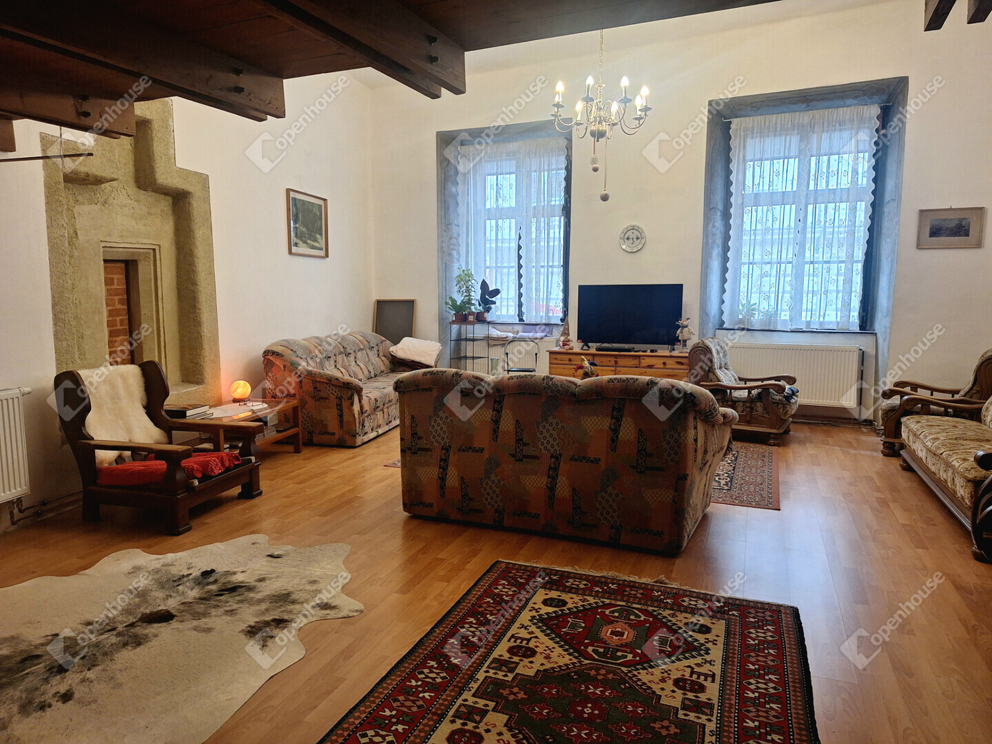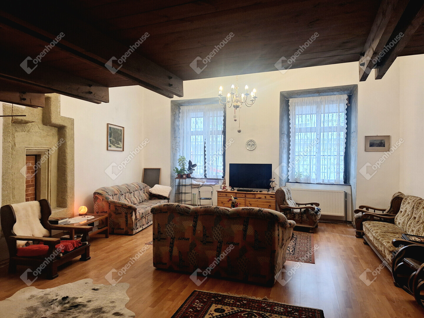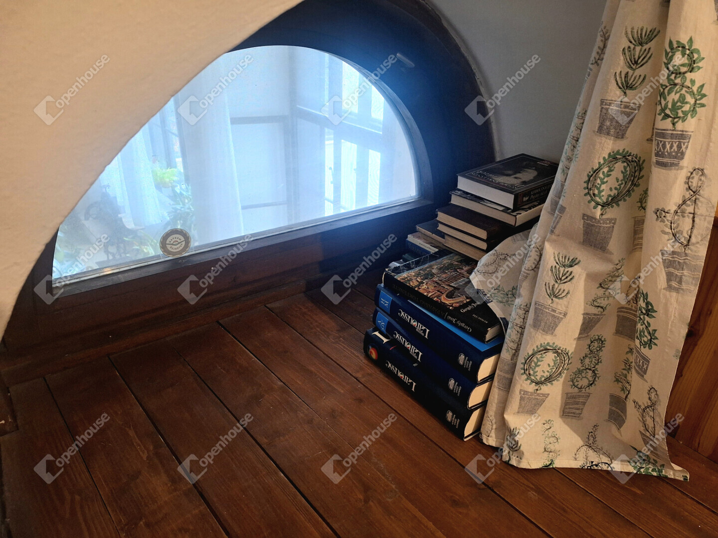 Külön figyelmet érdemel, hogy az ablakok belső részén, az úgynevezett ablakkávában (az ablak körüli belső falszakaszon) eredeti freskófestés maradt fenn, ami rendkívül ritka és exkluzív részlet. Ez a díszítés nemcsak esztétikai élményt nyújt, hanem tovább erősíti az ingatlan történelmi atmoszféráját és egyediségét.