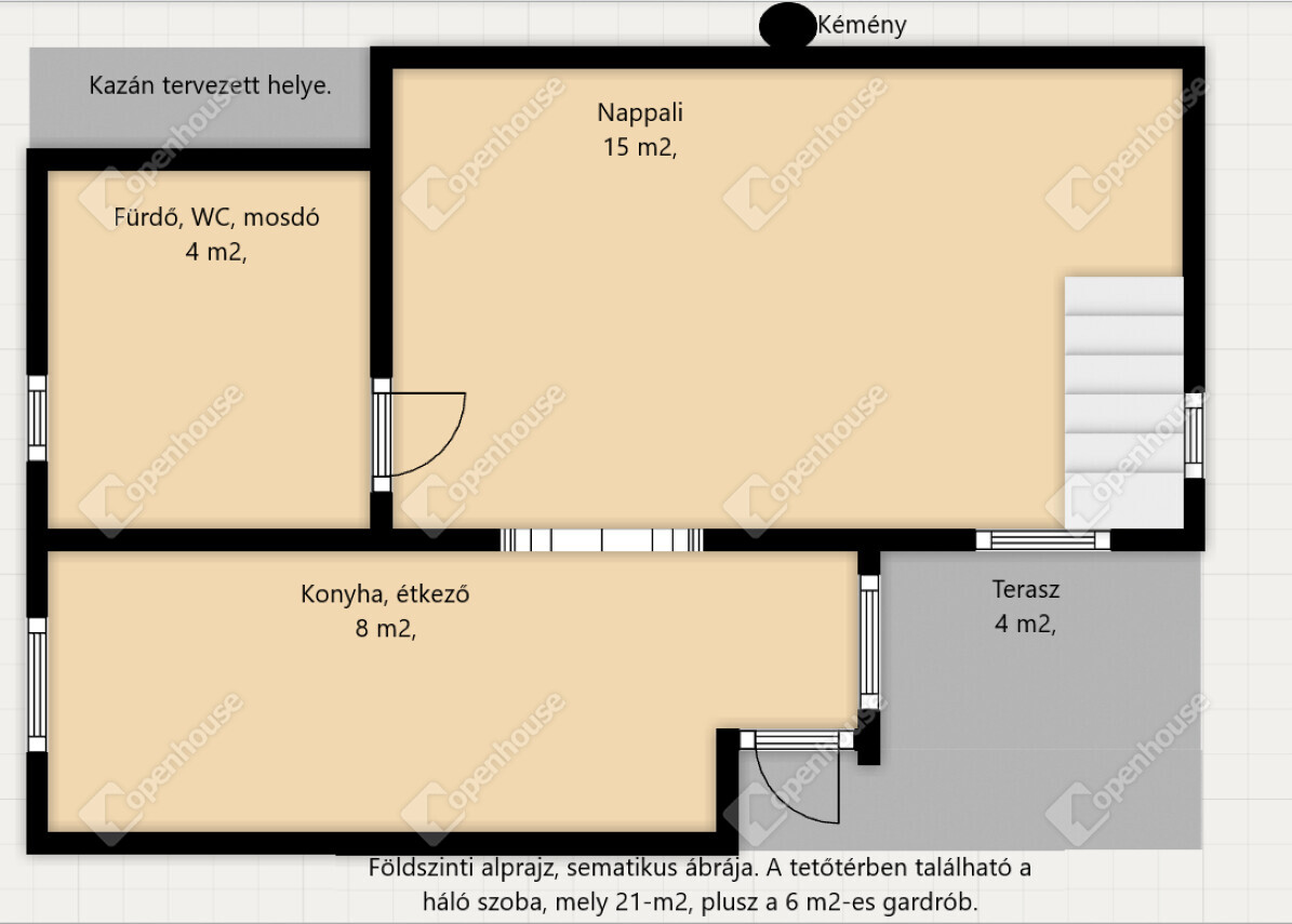 - a tetőtér beépített 5m2-es, gardróbbal, a nappaliból megközelíthető egy fa lépcsőn,