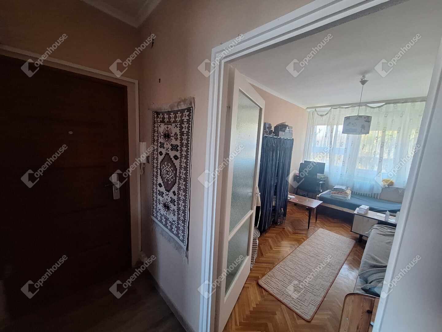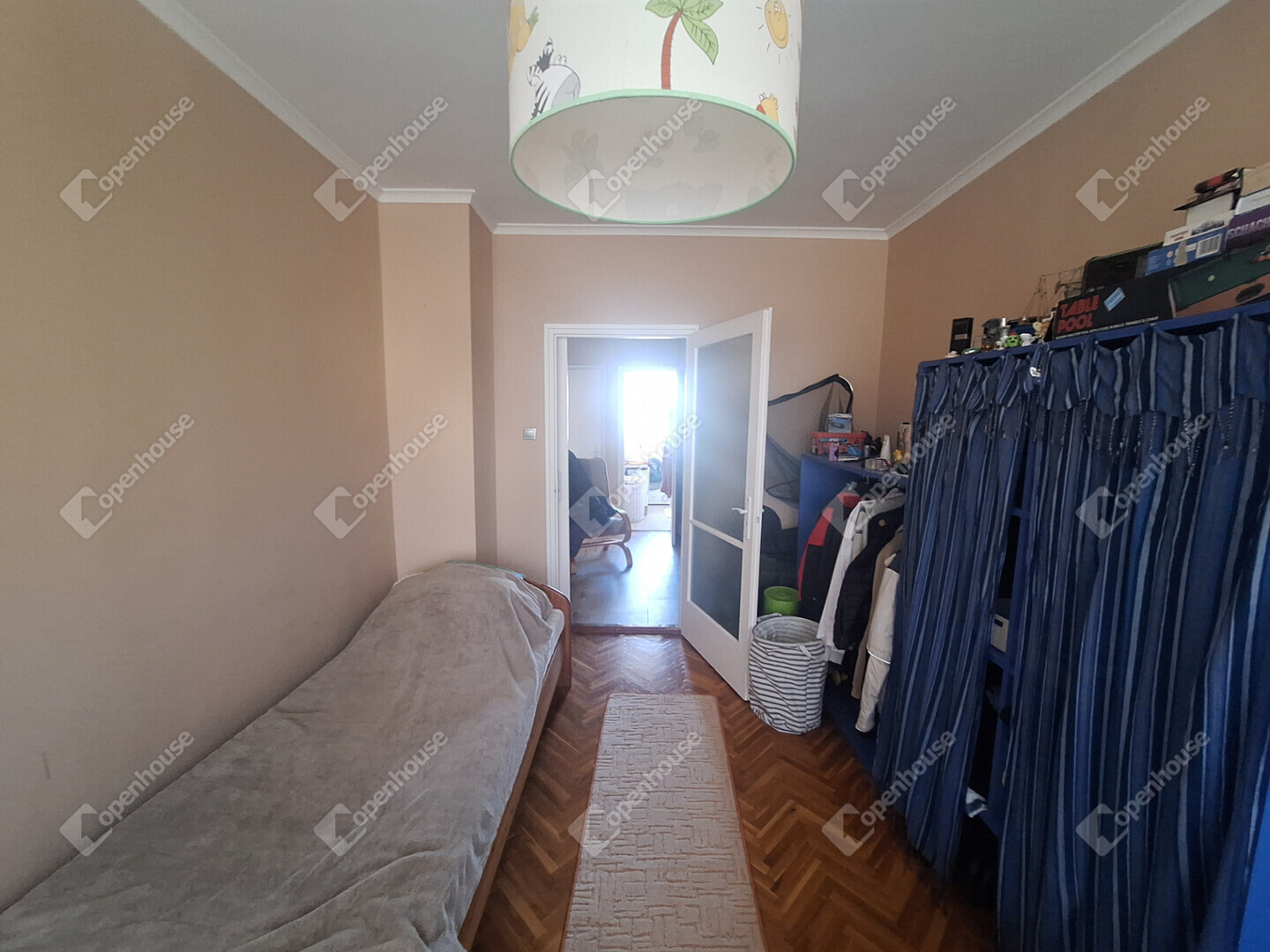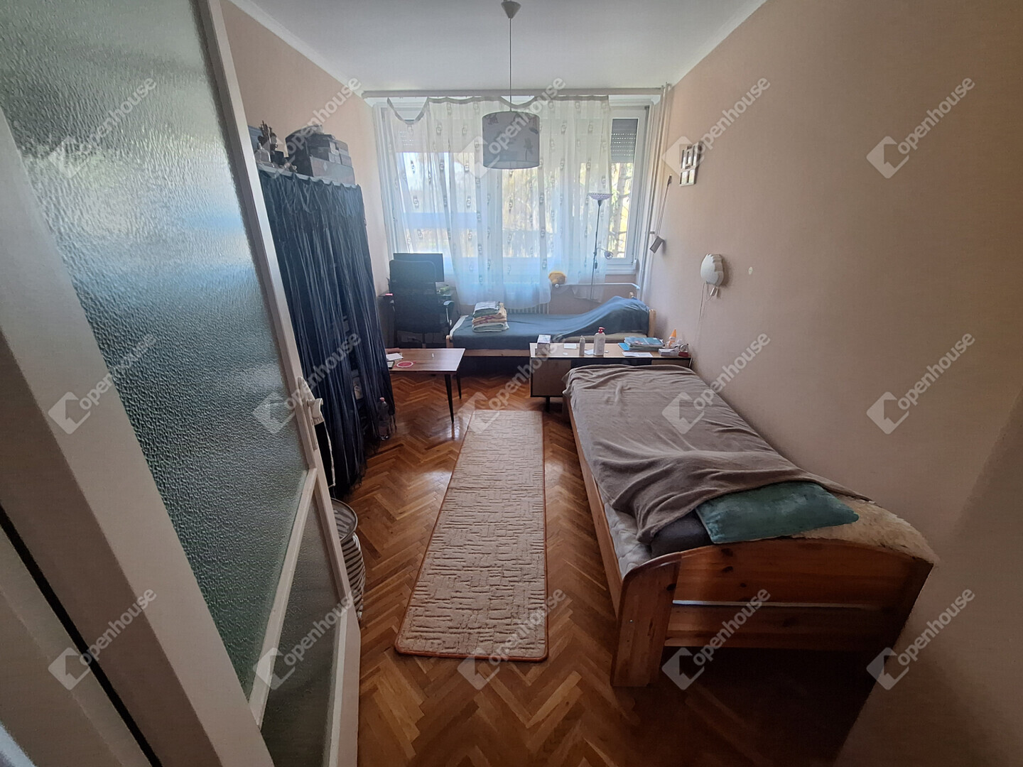 A lakás elosztása jó, minden szoba külön nyílik. A szobákban jó minőségű faparketta, a többi helyiség járólapos.