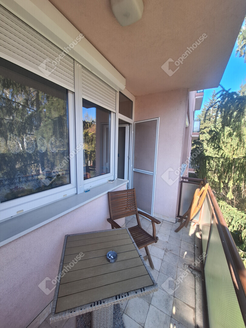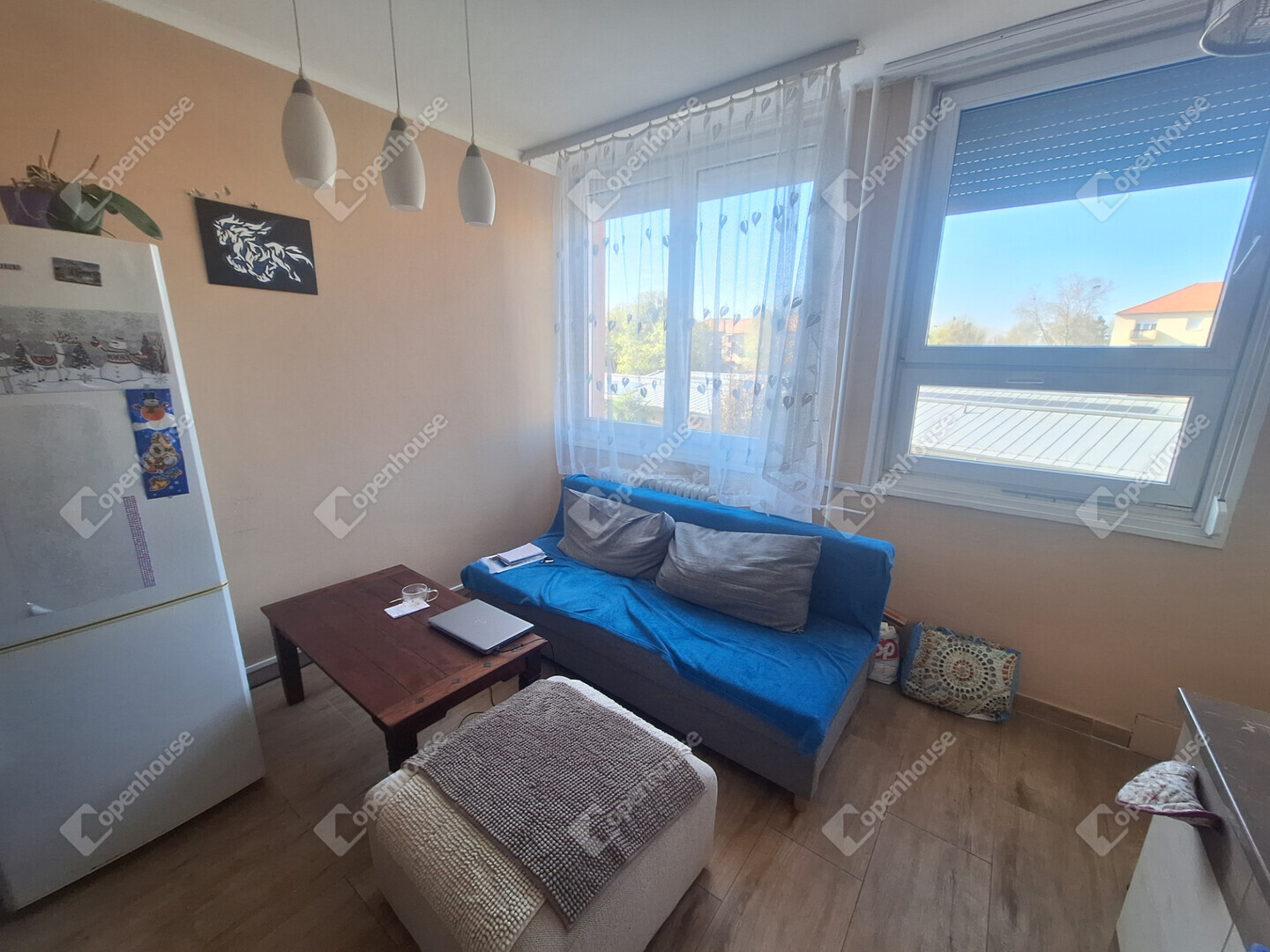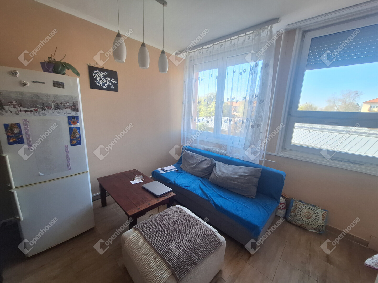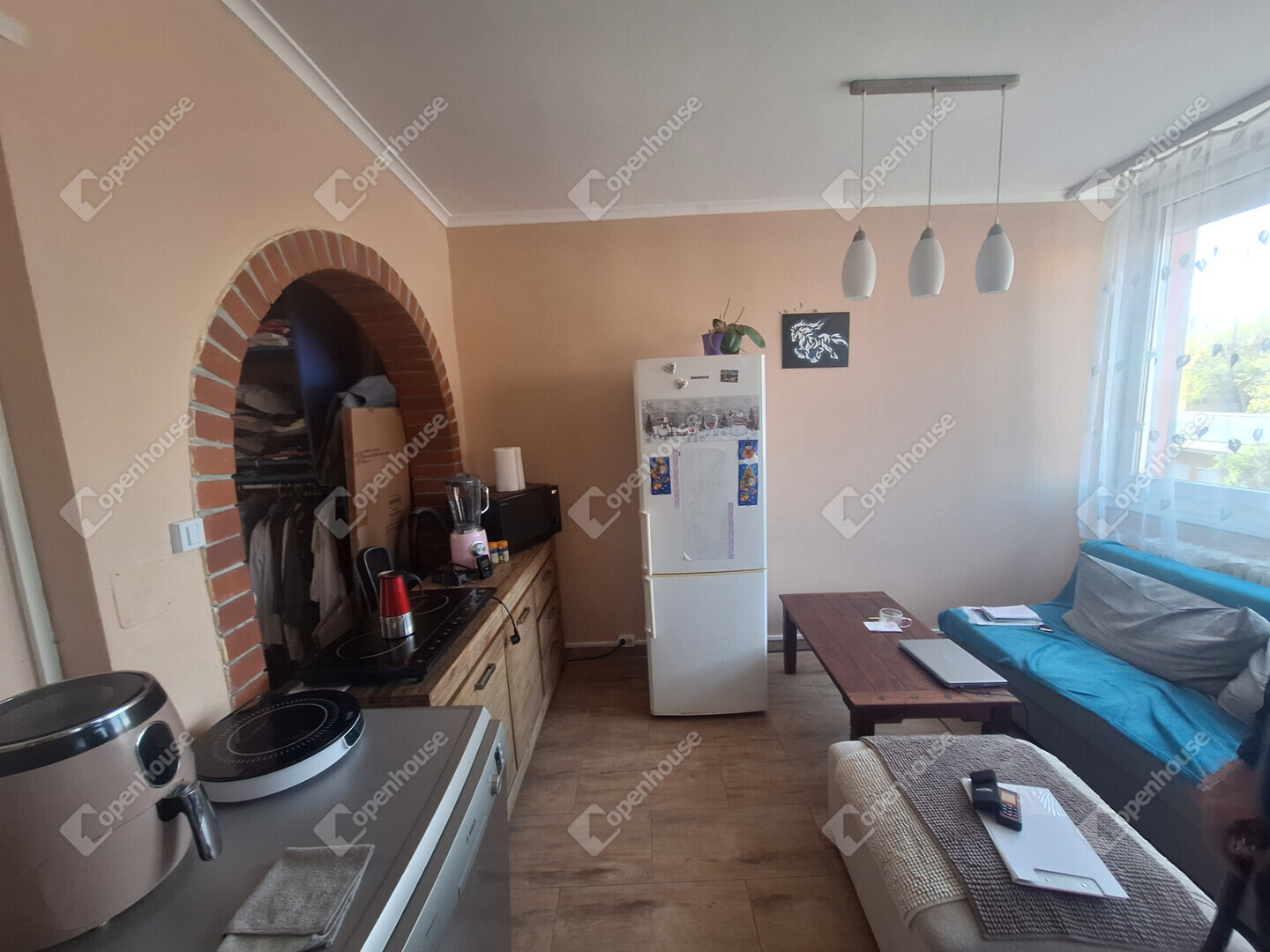 A konyha és a nappali egy légtérben található, innen egy boltíves átjárón is bejuthatunk a nagyobbik szobába. A nagyobbik szobából nyílik az erkély, amit egy nagy fenyőfa közelsége tesz hangulatossá.