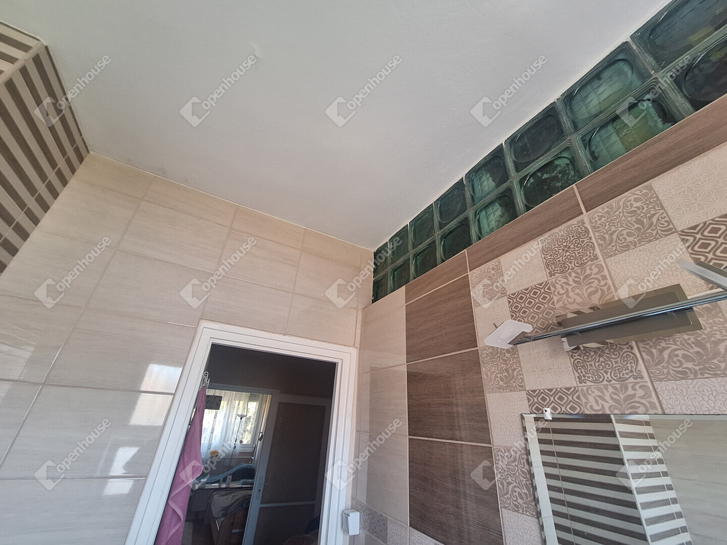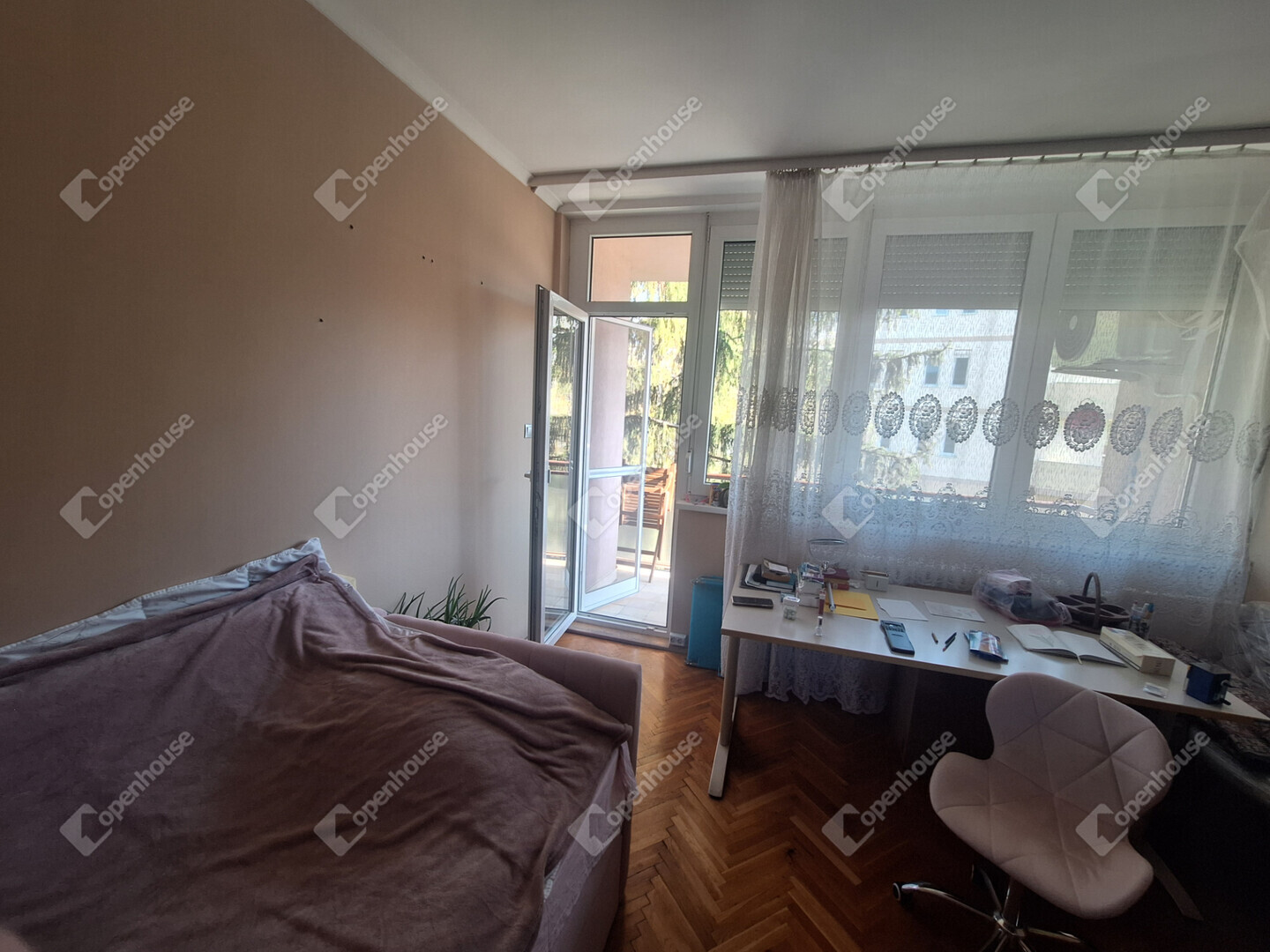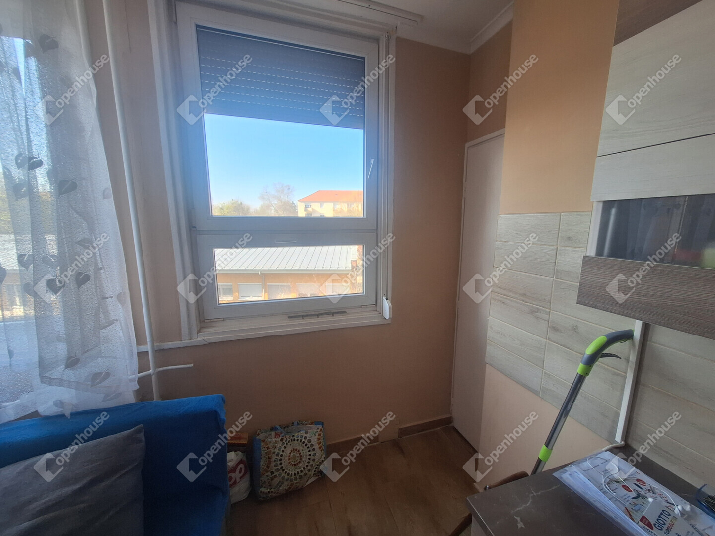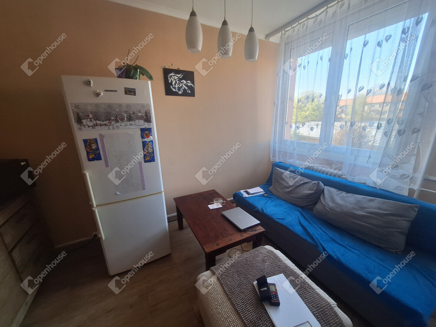 A konyha és a nappali egy légtérben található, innen egy boltíves átjárón is bejuthatunk a nagyobbik szobába. A nagyobbik szobából nyílik az erkély, amit egy nagy fenyőfa közelsége tesz hangulatossá.