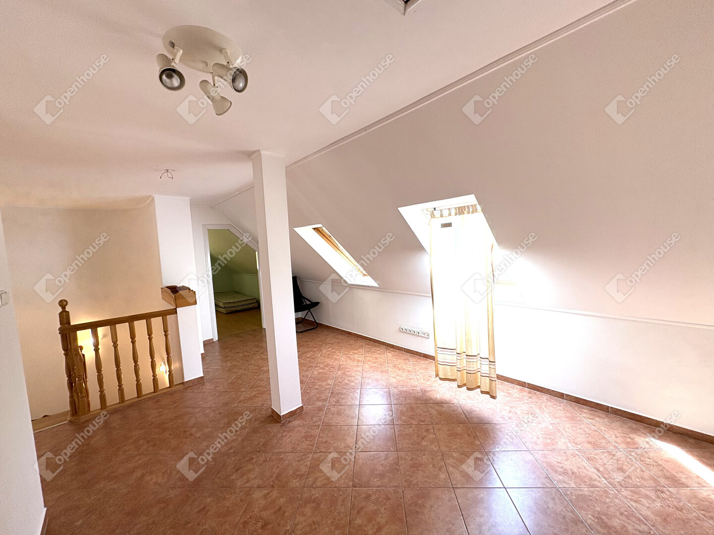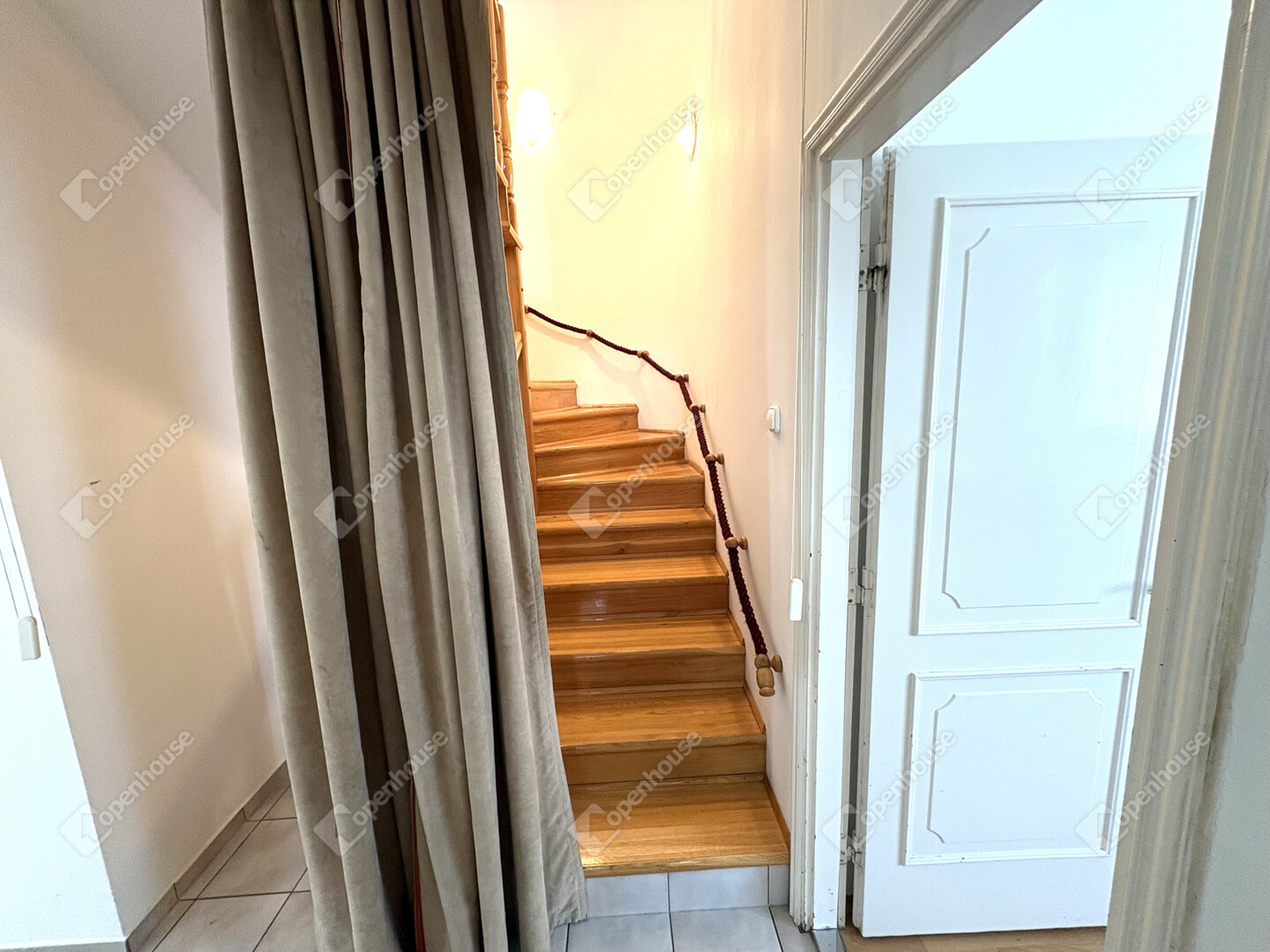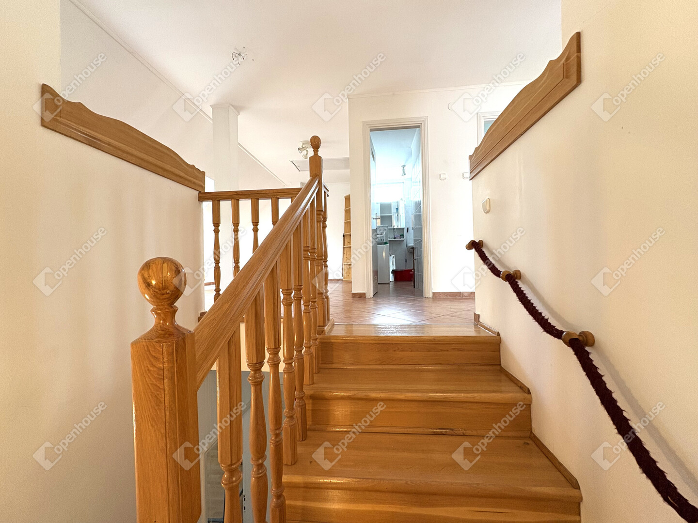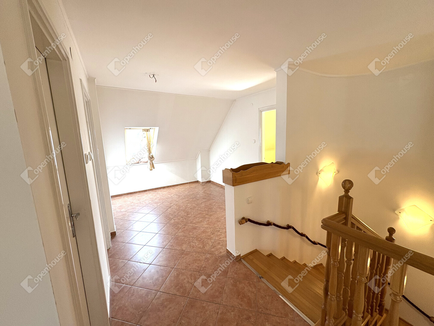 Az emeletre egy igényesen kialakított fa lépcső vezet. A ház vasbeton födémmel rendelkezik, így a padlástér is jól használható.