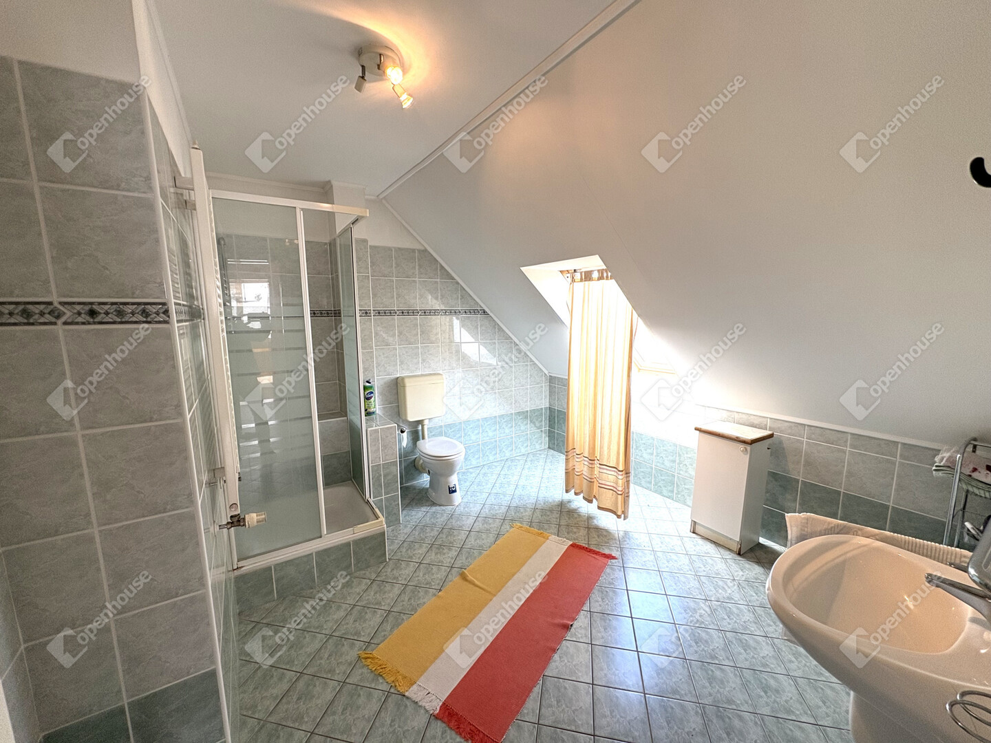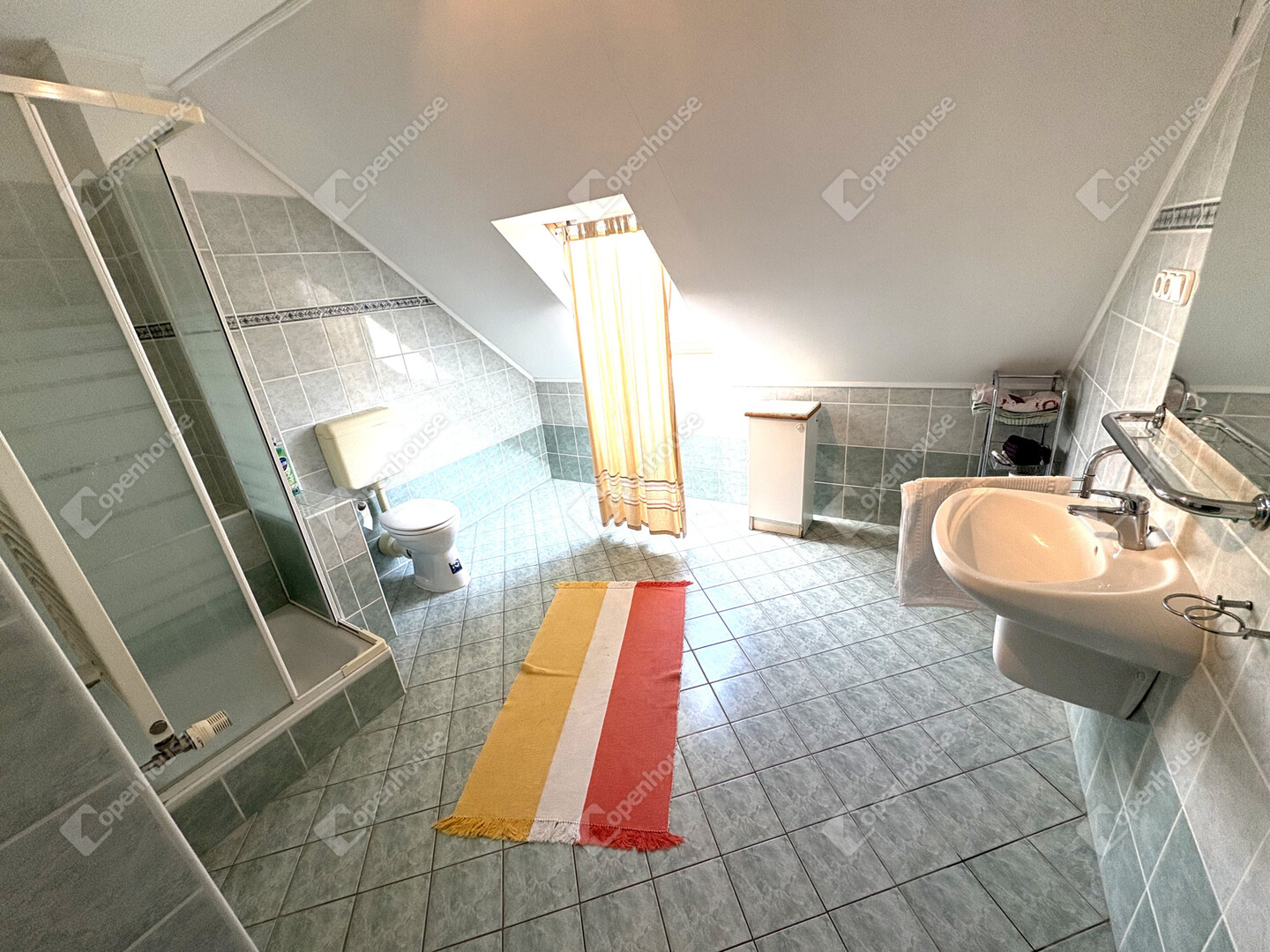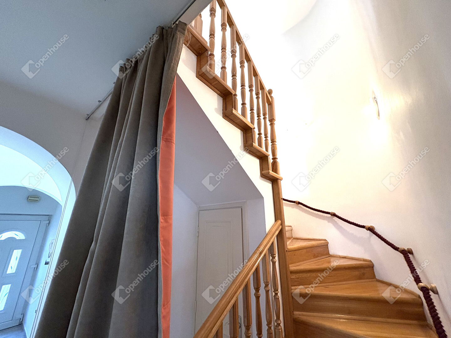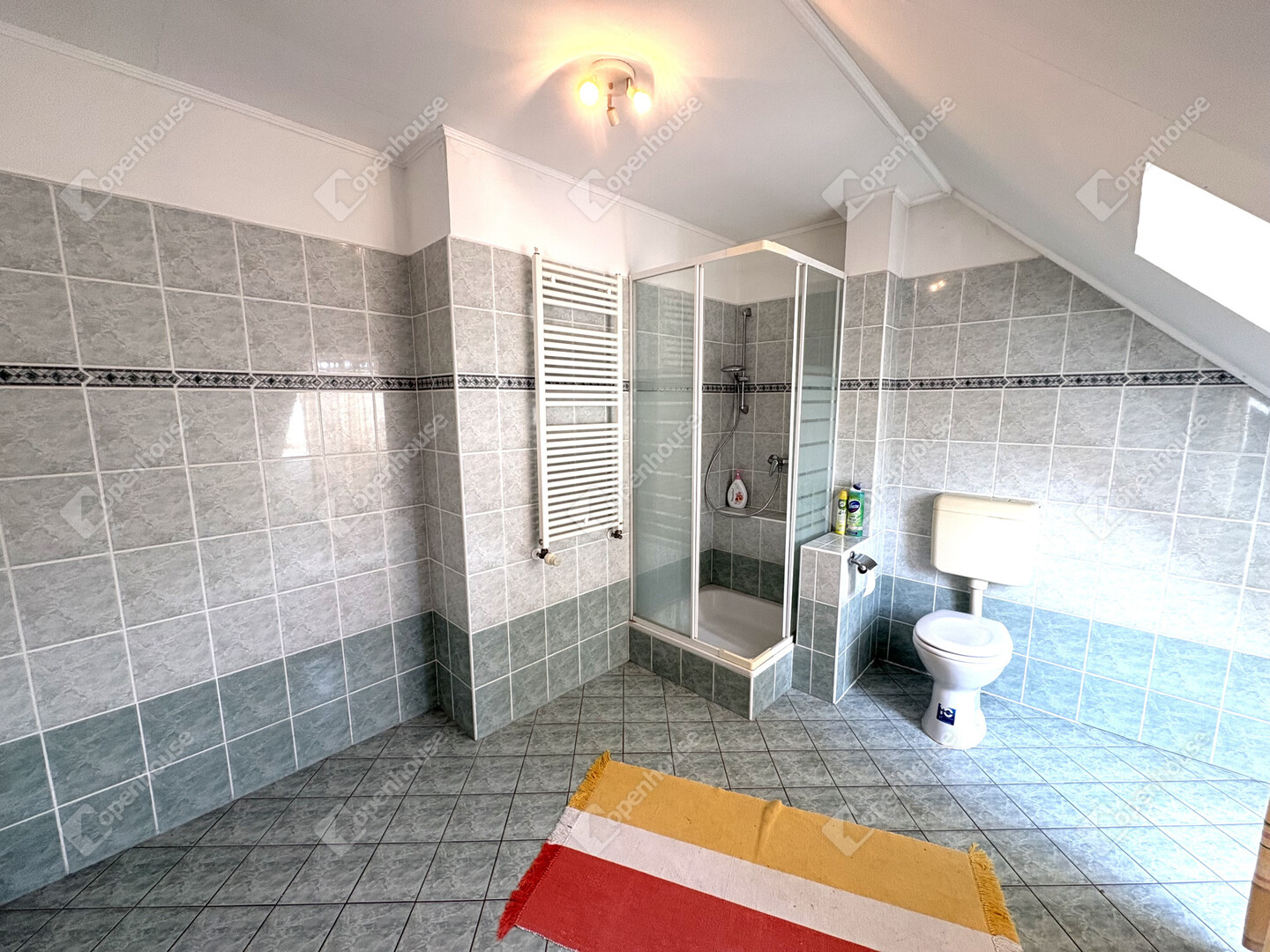 Az emeletre egy igényesen kialakított fa lépcső vezet. A ház vasbeton födémmel rendelkezik, így a padlástér is jól használható.