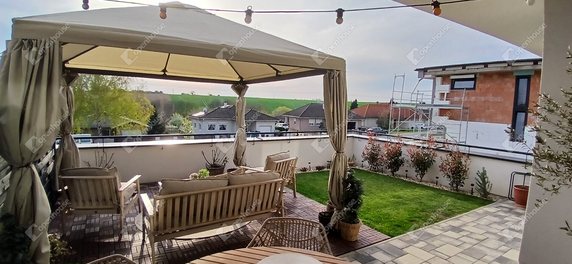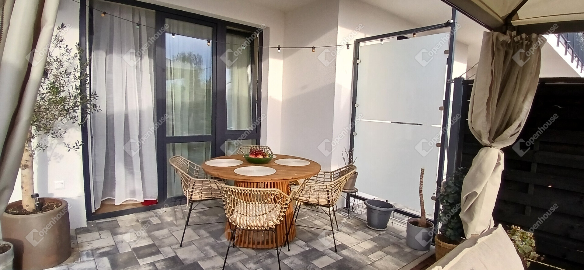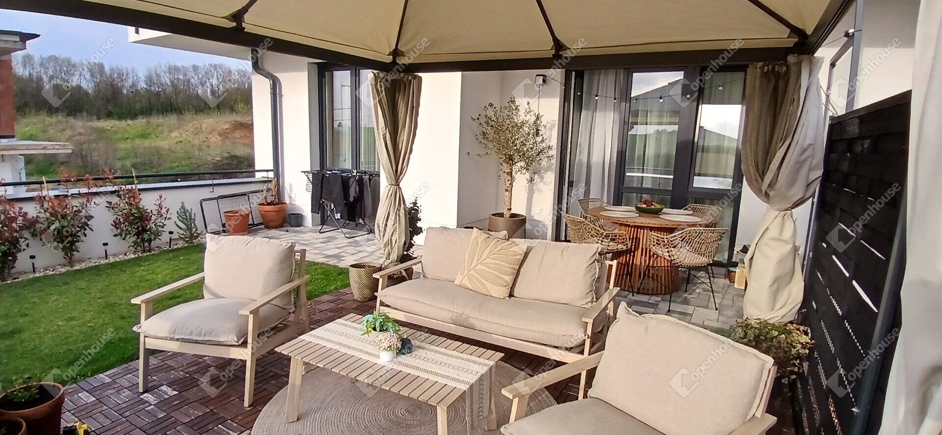 A nappali és az egyik szoba közvetlen kapcsolata a hatalmas terasszal olyan térélményt ad, amit ritkán látni. A burkolt és zöld felület kombinációja, a pavilon, a növények – ez nem csak egy terasz, hanem egy privát kerthelyiség.