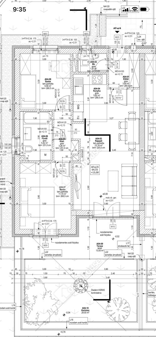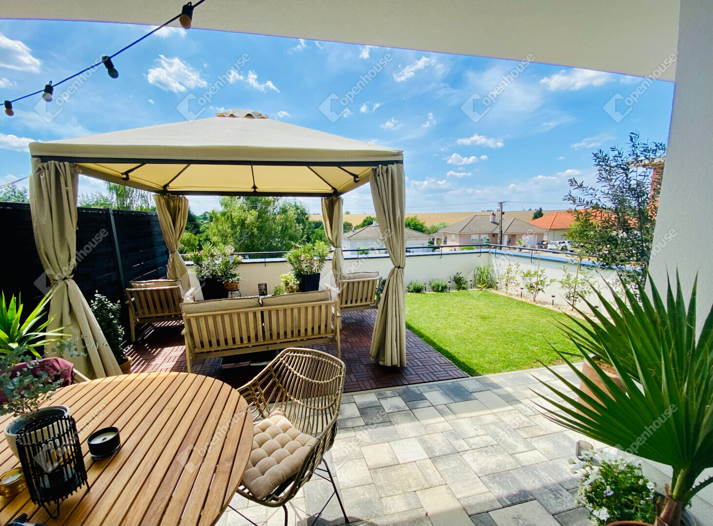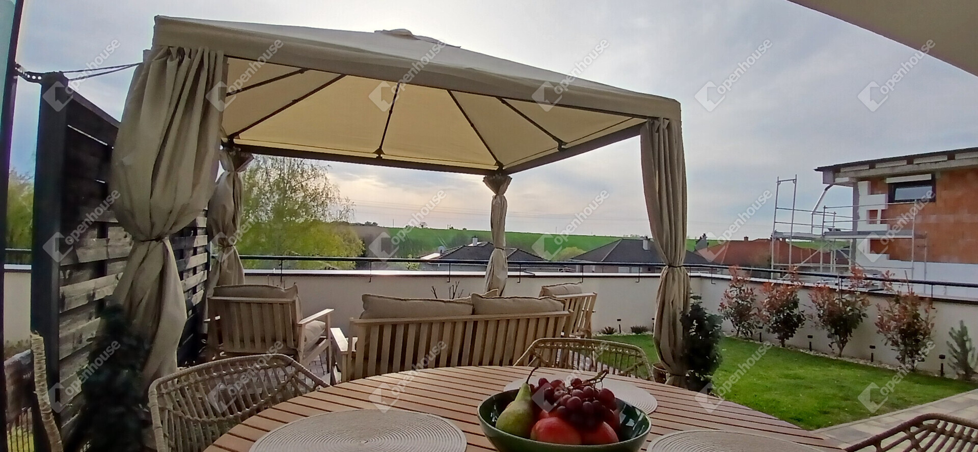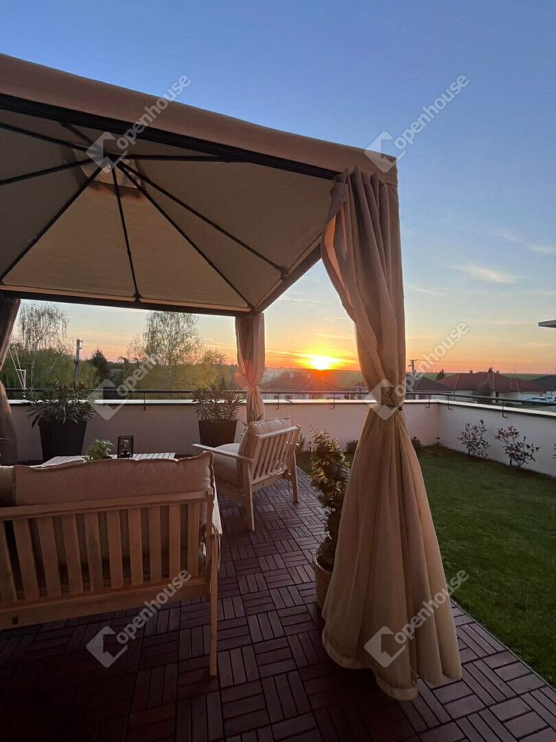 A nappali és az egyik szoba közvetlen kapcsolata a hatalmas terasszal olyan térélményt ad, amit ritkán látni. A burkolt és zöld felület kombinációja, a pavilon, a növények – ez nem csak egy terasz, hanem egy privát kerthelyiség.