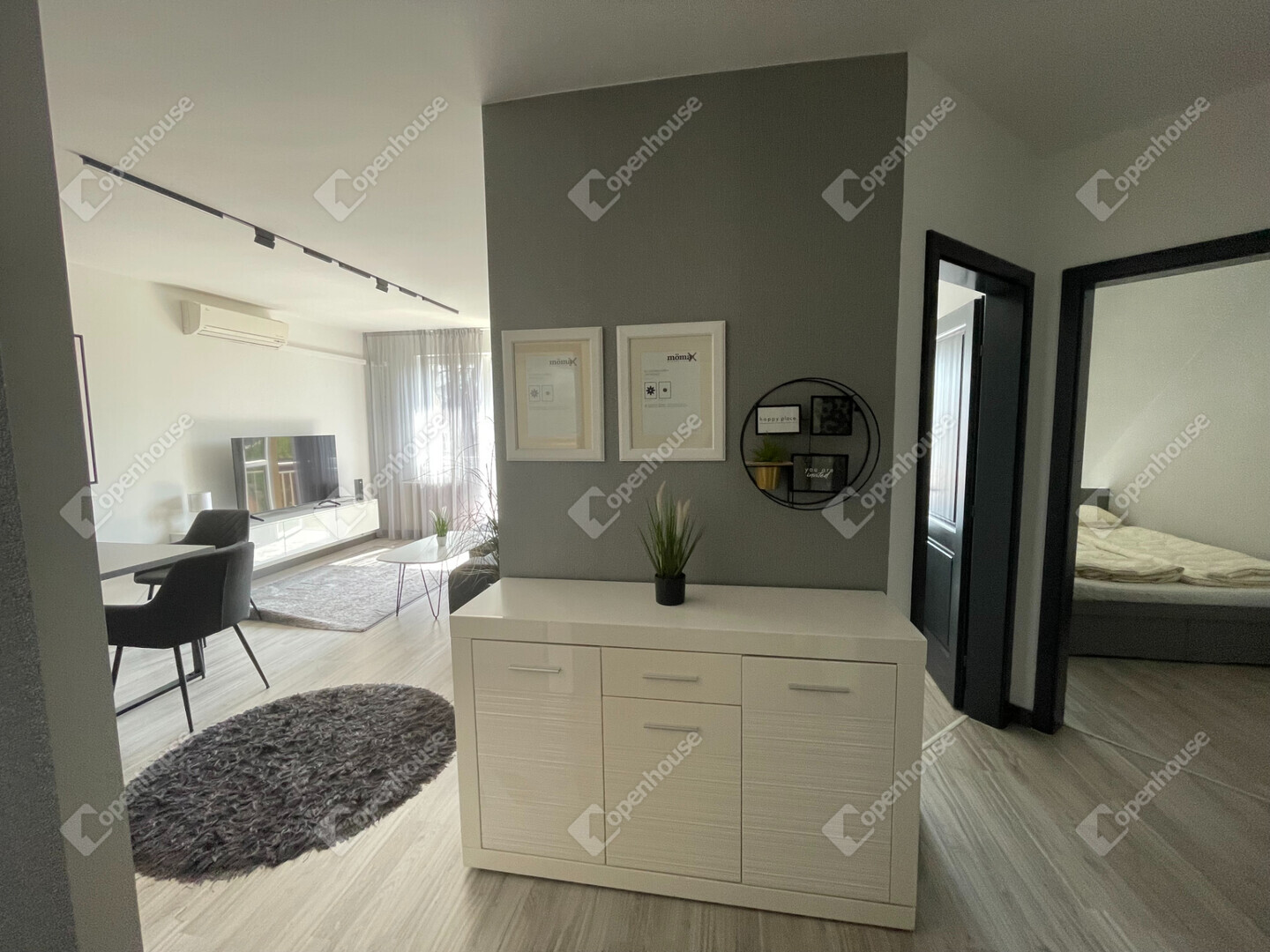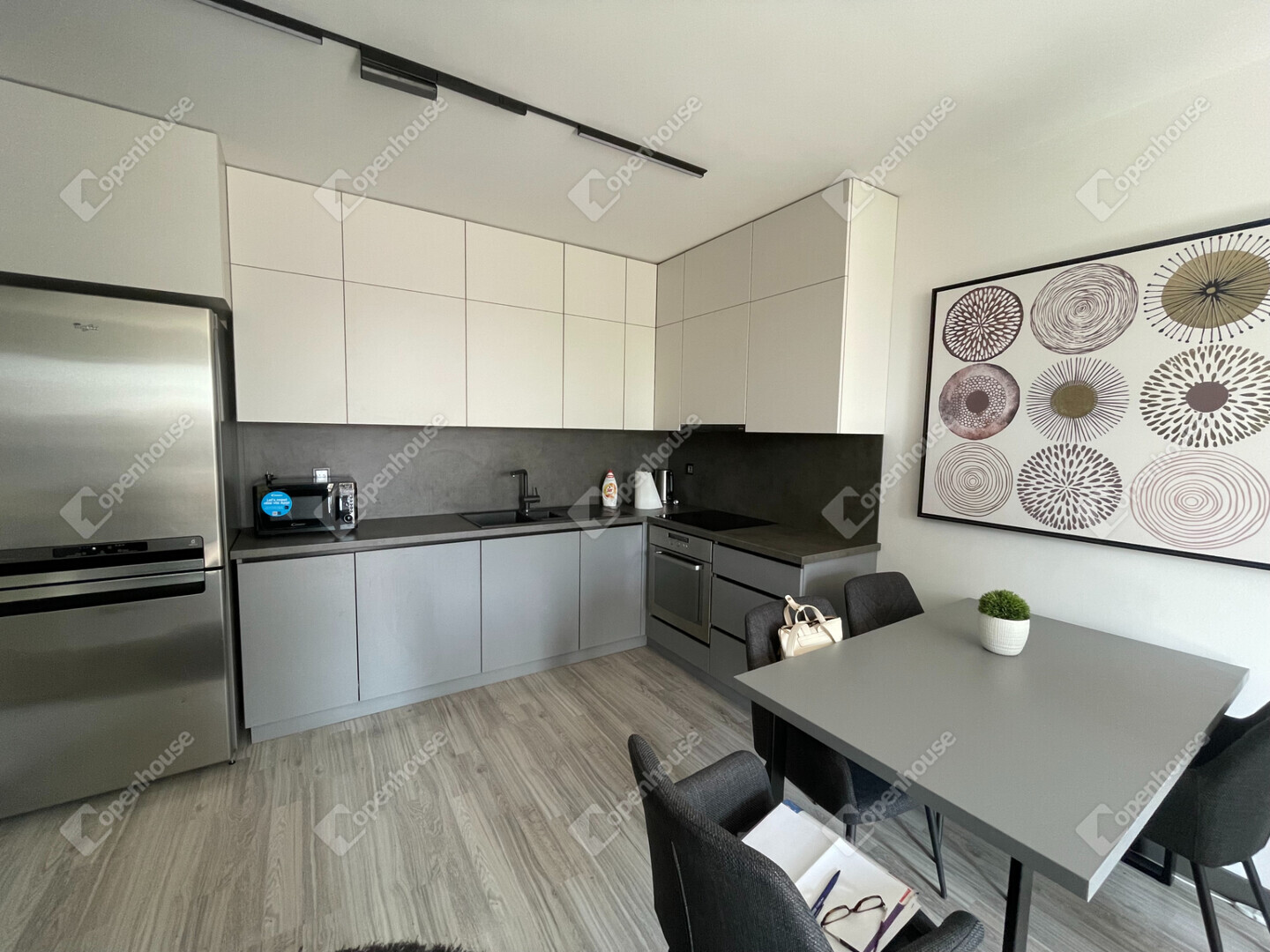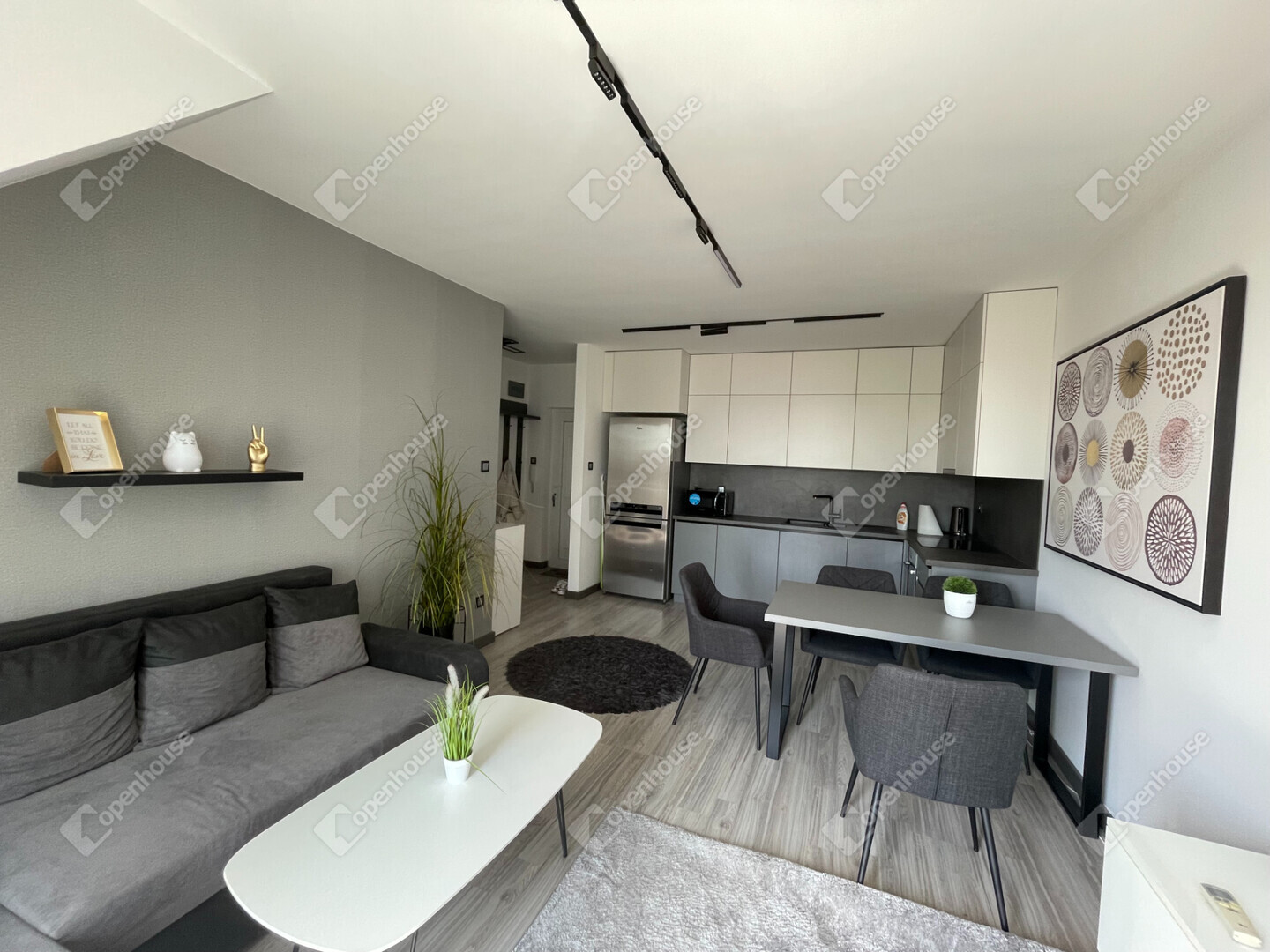 - A nappali, konyha és az étkező egyetlen légtérben helyezkedik el, modern beépített bútorokkal és teljes konyhai gépparkkal.