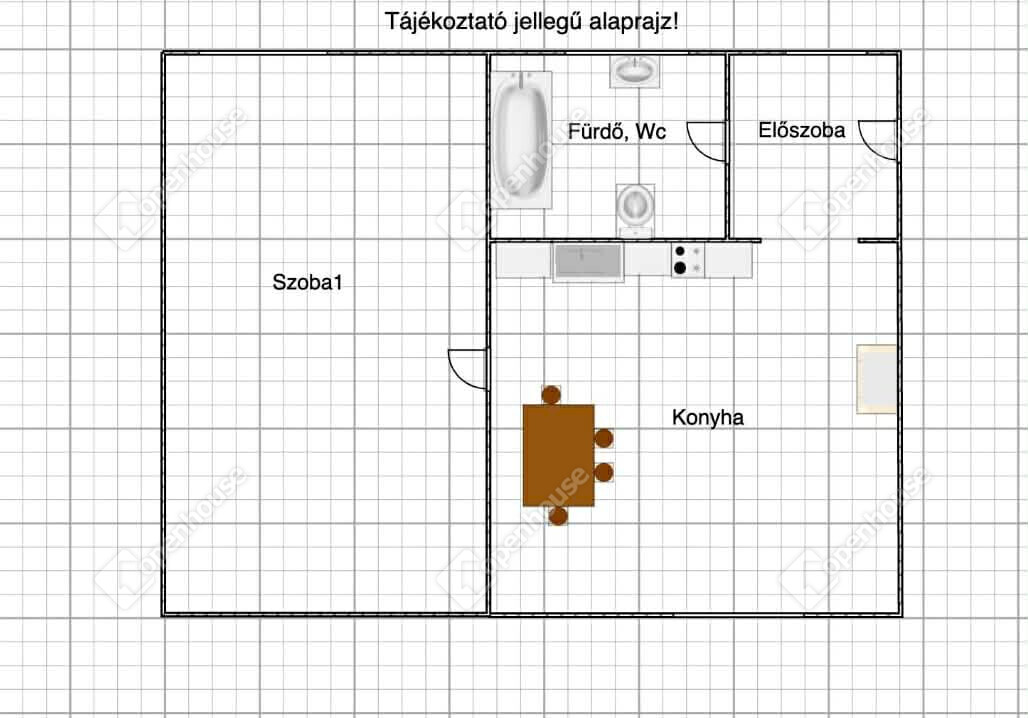 tágas konyha-étkező, előszoba, kádas fürdőszoba, valamint egy nagy méretű szoba található benne, amely igény esetén akár ketté is osztható, így a jelenlegi elrendezés tovább alakítható.