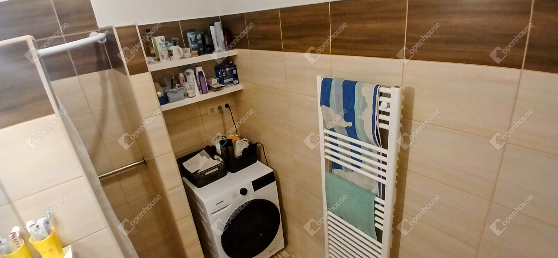 A fürdőszoba modern tusolóval felszerelt, ahol a természetes fény elegánsan, üvegtéglákon keresztül szűrődik be, tovább növelve a tér érzetét és hangulatát. Az ingatlanhoz tartozik egy 2,4 nm-es saját tároló, valamint egy közös tárolóhelyiség is, ami további kényelmet biztosít.