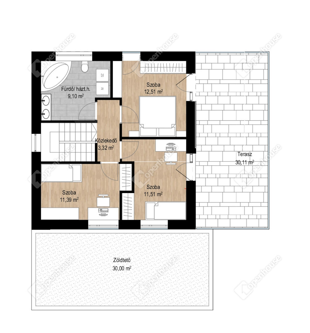 | Közlekedő | 3.32 m2 | Laminált padló |