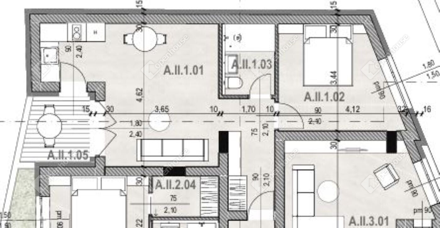 A.II.1 lakás a társasház 2. emeletén található 42,51 m2 lakótér + 4,77 m2 terasz + 2,12 m2 lakószinten elhelyezkedő tároló.