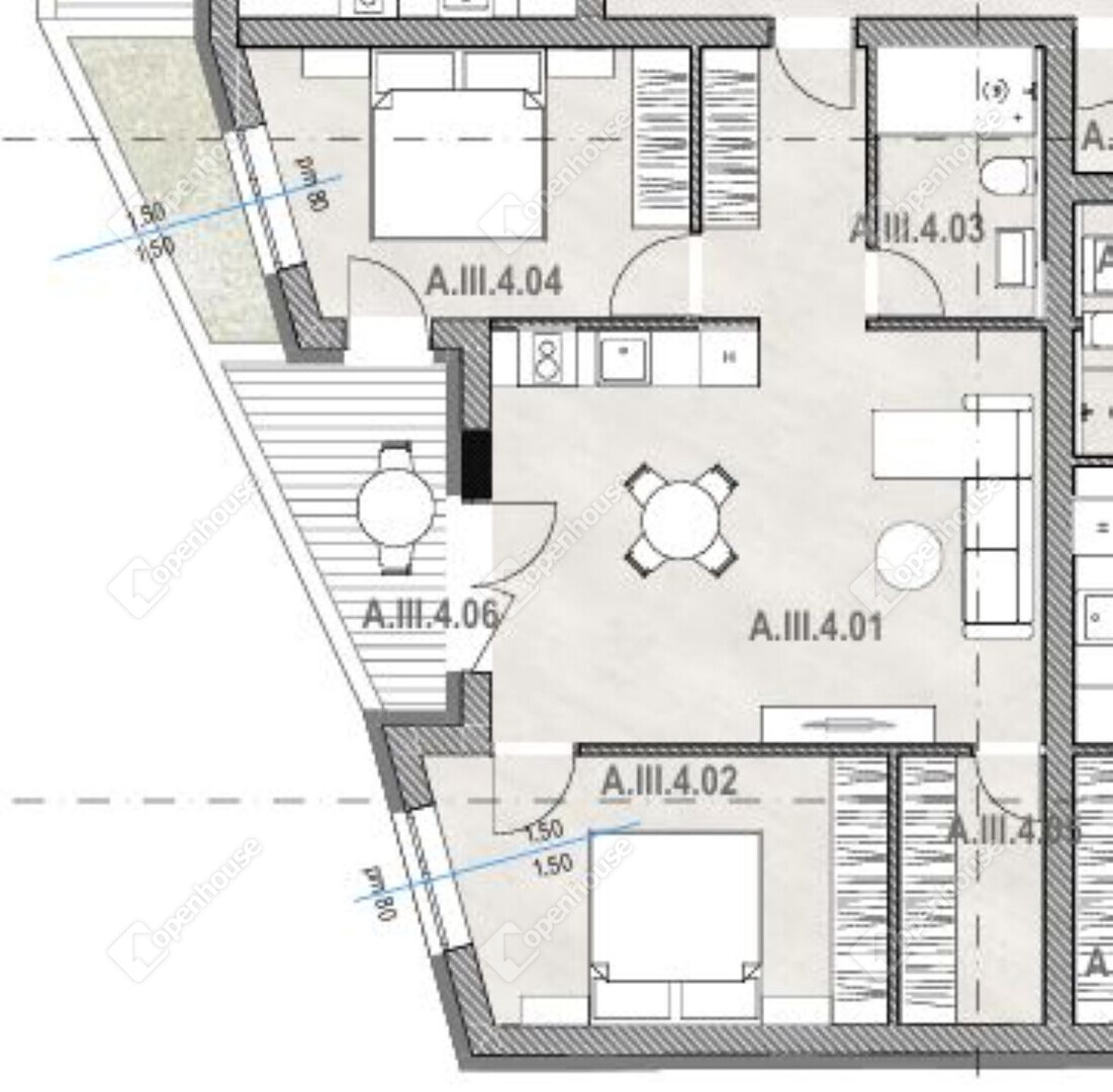 A.III.4 lakás a társasház 3. emeletén található 62,63 m2 lakótér + 5,59 m2 terasz.