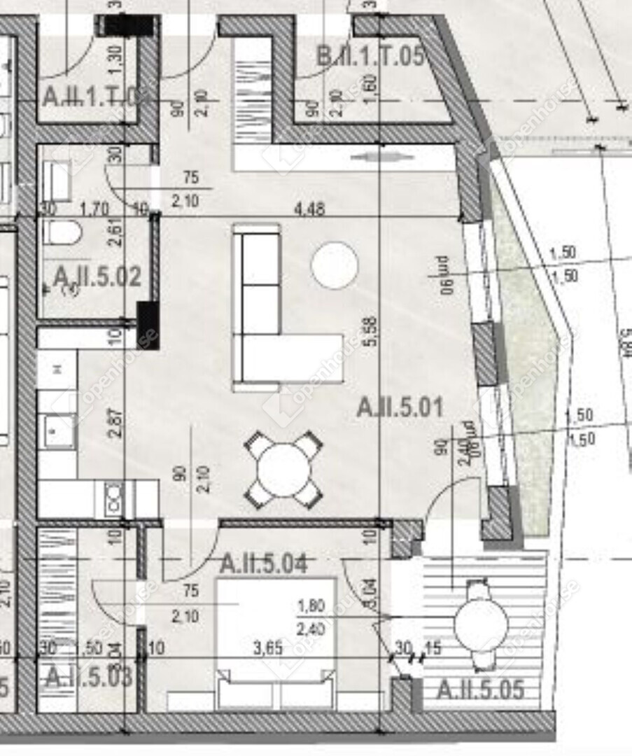 A.II.5 lakás a társasház 2. emeletén található 53,51 m2 lakótér + 4,32 m2 terasz.