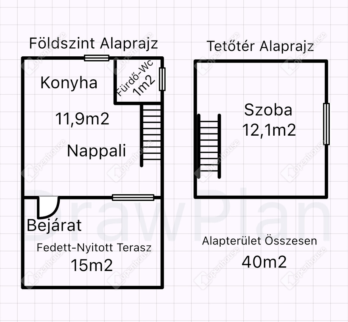 -Helyiségek 40m2 alapterületen: földszinten konyha, fürdő-wc, terasz.Tetőtérben szoba.